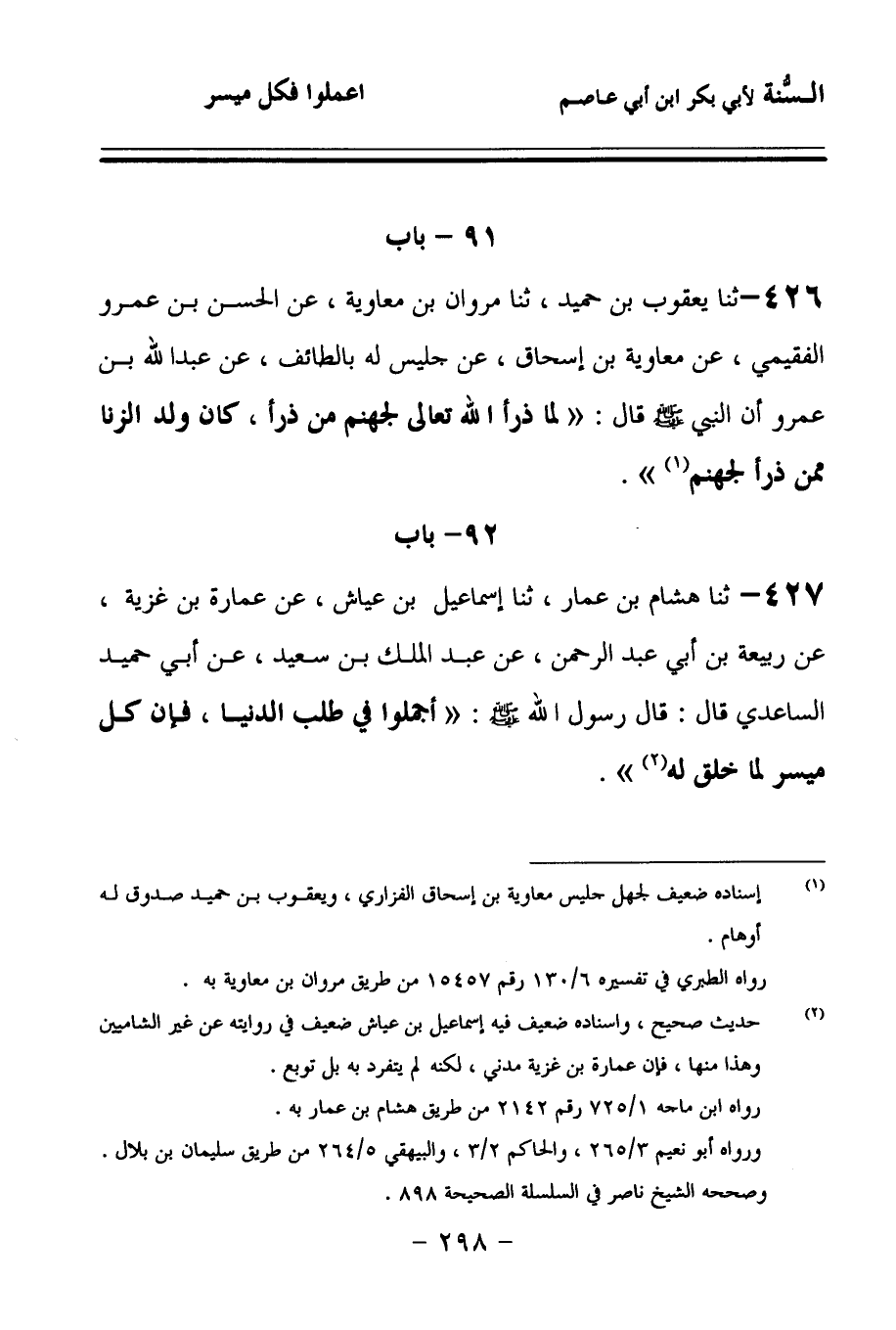 426 - حَدَّثنا يَعْقُوبُ بْنُ حُمَيْدٍ، حَدَّثنا مَرْوَانُ بْنُ مُعَاوِيَةَ، عَنِ الْحَسَنِ بْنِ عَمْرٍو الْفُقَيْمِيِّ، عَنْ مُعَاوِيَةَ بْنِ إِسْحَاقَ، عَنْ جَلِيسٍ لَهُ بِالطَّائِفِ، عَنْ عَبْدِ اللهِ بْنِ عَمْرٍو، أَنَّ النَّبِيَّ صَلى الله عَلَيهِ وسَلمَ قَالَ: لَمَّا ذَرَأَ اللهُ تَعَالَى لِجَهَنَّمَ مَنْ ذَرَأَ، كَانَ وَلَدُ الزِّنَا مِمَّنْ ذَرَأَ لِجَهَنَّمَ.