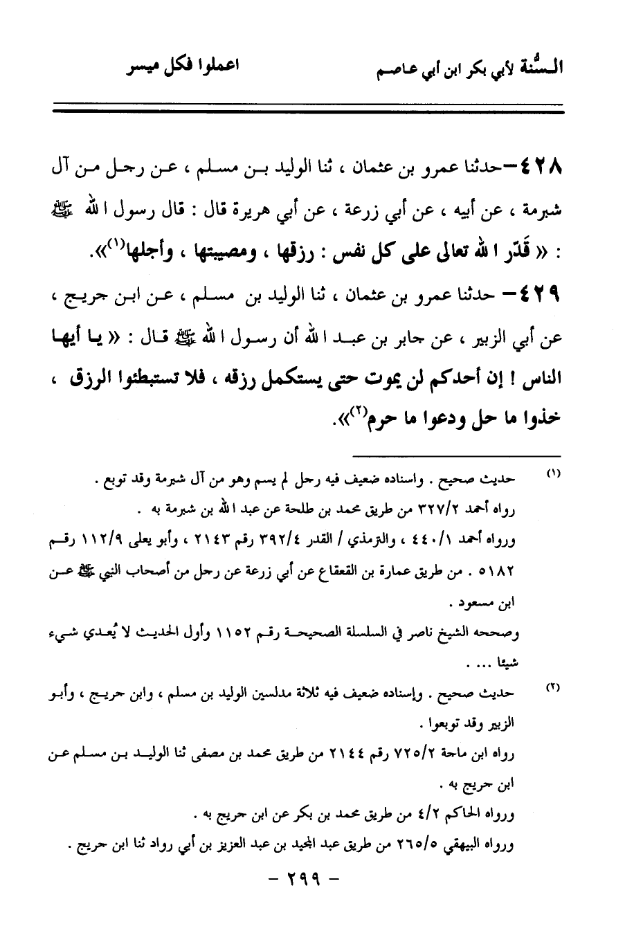429 - حَدَّثنا عَمْرُو بْنُ عُثْمَانَ، حَدَّثنا الْوَلِيدُ بْنُ مُسْلِمٍ، عَنِ ابْنِ جُرَيْجٍ، عَنْ أَبِي الزُّبَيْرِ، عَنْ جَابِرِ بْنِ عَبْدِ اللهِ، أَنَّ رَسُولَ اللهِ صَلى الله عَلَيهِ وسَلمَ قَالَ: يَا أَيُّهَا النَّاسُ, إِنَّ أَحَدَكُمْ لَنْ يَمُوتَ حَتَّى يَسْتَكْمِلَ رِزْقَهُ، فَلاَ تَسْتَبْطِئُوا الرِّزْقَ، خُذُوا مَا حَلَّ، وَدَعُوا مَا حَرُمَ.