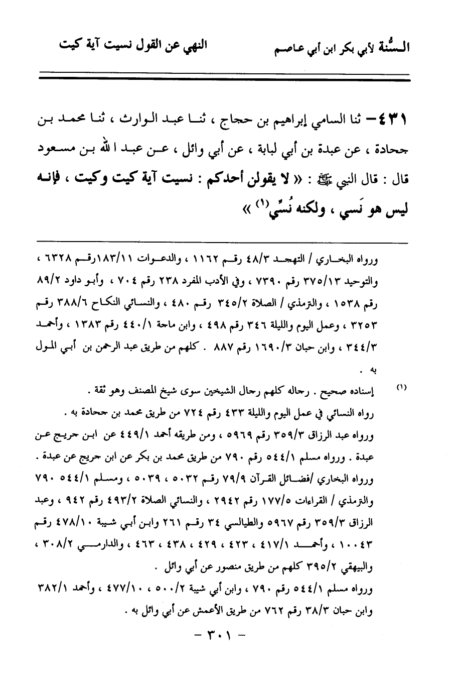 431 - حَدَّثنا السَّامِيُّ إِبْرَاهِيمُ بْنُ حَجَّاجٍ، حَدَّثنا عَبْدُ الْوَارِثِ، حَدَّثنا مُحَمَّدُ بْنُ جُحَادَةَ، عَنْ عَبْدَةَ بْنِ أَبِي لُبَابَةَ، عَنْ أَبِي وَائِلٍ، عَنْ عَبْدِ اللهِ بْنِ مَسْعُودٍ، قَالَ: قَالَ النَّبِيُّ صَلى الله عَلَيهِ وسَلمَ: لاَ يَقُولَنَّ أَحَدُكُمْ: نَسِيتُ آيَةَ كَيْتَ وَكَيْتَ، فَإِنَّهُ لَيْسَ هُوَ نَسِيَ؛ وَلَكِنَّهُ نُسِّيَ.