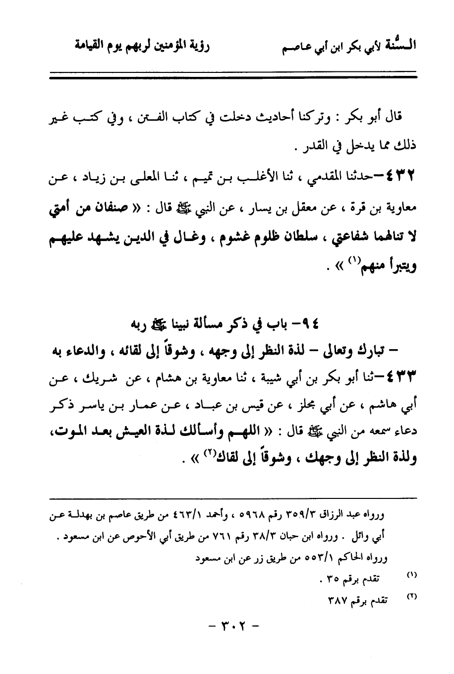 94 - بَابٌ فِي ذِكْرِ مَسْأَلَةِ نَبِيِّنَا صَلى الله عَلَيهِ وسَلمَ رَبَّهُ تَبَارَكَ وَتَعَالَى لَذَّةَ النَّظَرِ إِلَى وَجْهِهِ وَشَوْقًا إِلَى لِقَائِهِ، وَالدُّعَاءِ بِهِ.