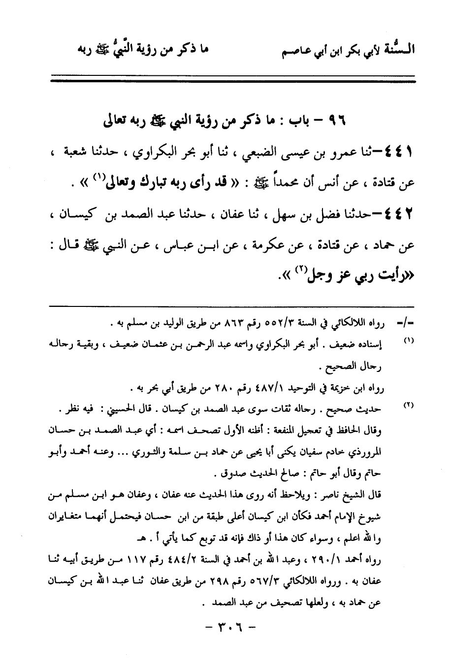 441 - حَدَّثنا عَمْرُو بْنُ عِيسَى الضُّبَعِيُّ، حَدَّثنا أَبُو بَحْرٍ الْبَكْرَاوِيُّ، حَدَّثنا شُعْبَةُ، عَنْ قَتَادَةَ، عَنْ أَنَسٍ، أَنَّ مُحَمَّدًا صَلى الله عَلَيهِ وسَلمَ قَدْ رَأَى رَبَّهُ تَبَارَكَ وَتَعَالَى.