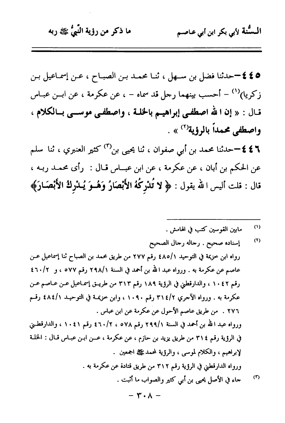 445 - حَدَّثنا فَضْلُ بْنُ سَهْلٍ، حَدَّثنا مُحَمَّدُ بْنُ الصَّبَّاحِ، عَنْ إِسْمَاعِيلَ بْنِ زَكَرِيَّا، أَحْسَبُ بَيْنَهُمَا رَجُلٌ قَدْ سَمَّاهُ، عَنْ عِكْرِمَةَ، عَنِ ابْنِ عَبَّاسٍ، قَالَ: إِنَّ اللهَ اصْطَفَى إِبْرَاهِيمَ بِالْخُلَّةِ، وَاصْطَفَى مُوسَى بِالْكَلاَمِ، وَاصْطَفَى مُحَمَّدًا بِالرُّؤْيَةِ.