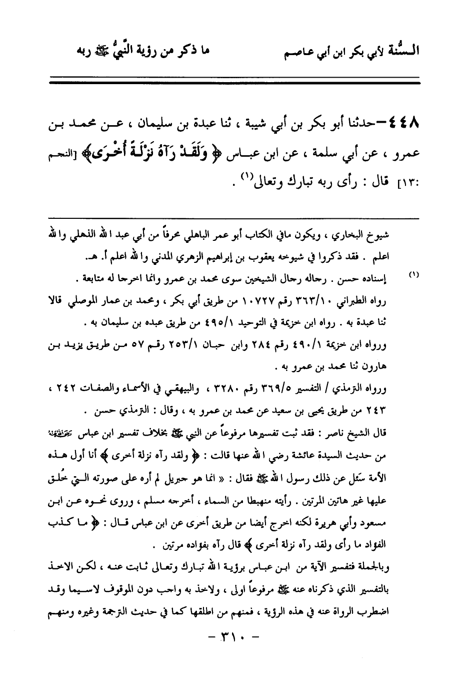 448 - حَدَّثنا أَبُو بَكْرِ بْنُ أَبِي شَيْبَةَ، حَدَّثنا عَبْدَةُ بْنُ سُلَيْمَانَ، عَنْ مُحَمَّدِ بْنِ عَمْرٍو، عَنْ أَبِي سَلَمَةَ، عَنِ ابْنِ عَبَّاسٍ: {وَلَقَدْ رَآهُ نَزْلَةً أُخْرَى} قَالَ: رَأَى رَبَّهُ تَبَارَكَ وَتَعَالَى.