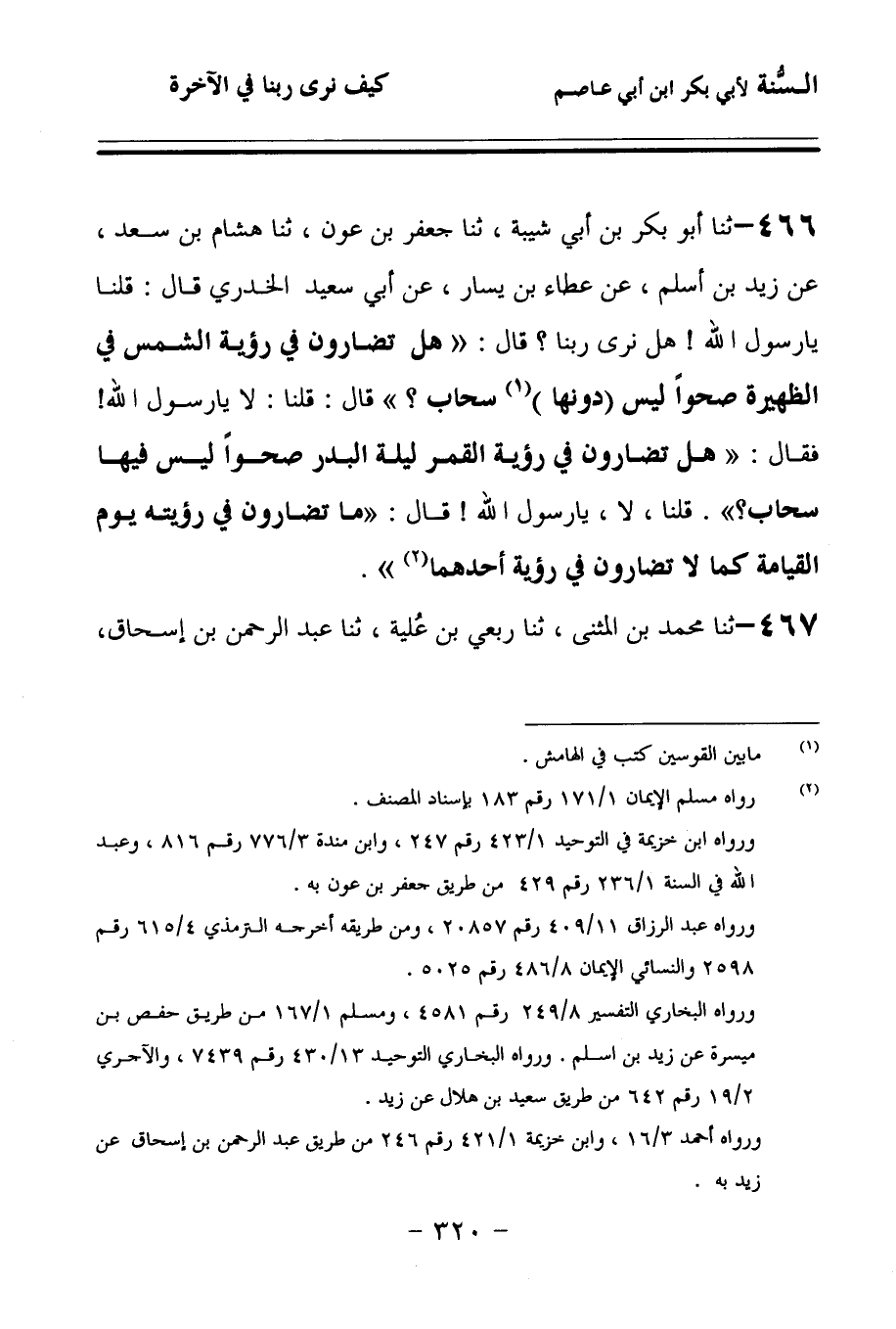 466 - حَدَّثنا أَبُو بَكْرِ بْنُ أَبِي شَيْبَةَ، حَدَّثنا جَعْفَرُ بْنُ عَوْنٍ، حَدَّثنا هِشَامُ بْنُ سَعْدٍ، عَنْ زَيْدِ بْنِ أَسْلَمَ، عَنْ عَطَاءِ بْنِ يَسَارٍ، عَنْ أَبِي سَعِيدٍ الْخُدْرِيِّ، قَالَ: قُلْنَا: يَا رَسُولَ اللهِ, هَلْ نَرَى رَبَّنَا؟ قَالَ: هَلْ تُضَارُّونَ فِي رُؤْيَةِ الشَّمْسِ فِي الظَّهِيرَةِ، صَحْوًا لَيْسَ دُونَهَا سَحَابٌ؟ قَالَ: قُلْنَا: لاَ، يَا رَسُولَ اللهِ، فَقَالَ: هَلْ تُضَارُّونَ فِي رُؤْيَةِ الْقَمَرِ لَيْلَةَ الْبَدْرِ، صَحْوًا لَيْسَ فِيهَا سَحَابٌ؟ قُلْنَا: لاَ، يَا رَسُولَ اللهِ، قَالَ: مَا تُضَارُّونَ فِي رُؤْيَتِهِ يَوْمَ الْقِيَامَةِ كَمَا لاَ تُضَارُّونَ فِي رُؤْيَةِ أَحَدِهِمَا.