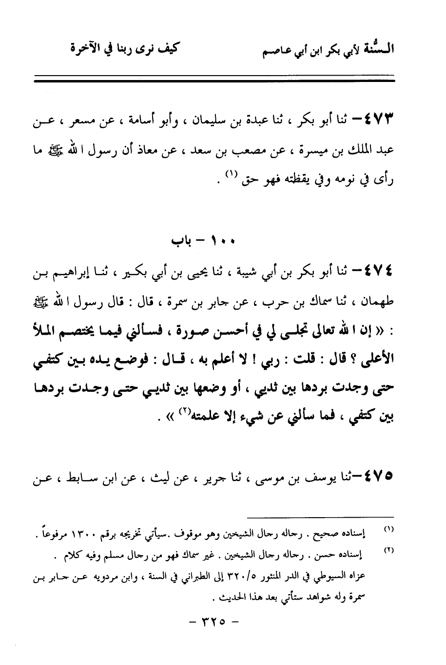 474 - حَدَّثنا أَبُو بَكْرِ بْنُ أَبِي شَيْبَةَ، حَدَّثنا يَحْيَى بْنُ أَبِي بُكَيْرٍ، حَدَّثنا إِبْرَاهِيمُ بْنُ طَهْمَانَ، حَدَّثنا سِمَاكُ بْنُ حَرْبٍ، عَنْ جَابِرِ بْنِ سَمُرَةَ، قَالَ: قَالَ رَسُولُ اللهِ صَلى الله عَلَيهِ وسَلمَ: إِنَّ اللهَ تَعَالَى تَجَلَّى لِي فِي أَحْسَنِ صُورَةٍ، فَسَأَلَنِي فِيمَا يَخْتَصِمُ الْمَلأُ الأَعْلَى؟ قَالَ: قُلْتُ: رَبِّي لاَ أَعْلَمُ بِهِ، قَالَ: فَوَضَعَ يَدَهُ بَيْنَ كَتِفَيَّ، حَتَّى وَجَدْتُ بَرْدَهَا بَيْنَ ثَدْيَيَّ, أَوْ وَضَعَهَا بَيْنَ ثَدْيَيَّ حَتَّى وَجَدْتُ بَرْدَهَا بَيْنَ كَتِفَيَّ, فَمَا سَأَلَنِي عَنْ شَيْءٍ إِلاَّ عَلِمْتُهُ.