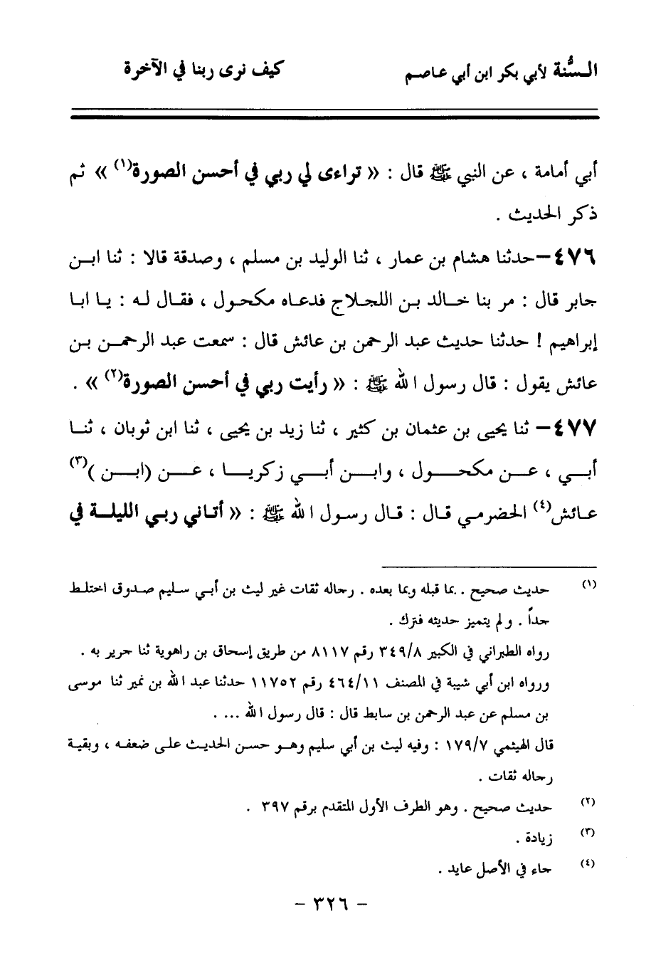 476 - حَدَّثنا هِشَامُ بْنُ عَمَّارٍ، حَدَّثنا الْوَلِيدُ بْنُ مُسْلِمٍ، وَصَدَقَةُ، قَالاَ: حَدَّثنا ابْنُ جَابِرٍ، قَالَ: مَرَّ بِنَا خَالِدُ بْنُ اللَّجْلاَجِ، فَدَعَاهُ مَكْحُولٌ، فَقَالَ لَهُ: يَا أَبَا إِبْرَاهِيمَ, حَدِّثْنَا حَدِيثَ عَبْدِ الرَّحْمَنِ بْنِ عَائِشٍ، قَالَ: سَمِعْتُ عَبْدَ الرَّحْمَنِ بْنَ عَائِشٍ يَقُولُ: قَالَ رَسُولُ اللهِ صَلى الله عَلَيهِ وسَلمَ: رَأَيْتُ رَبِّي فِي أَحْسَنِ الصُّورَةِ.