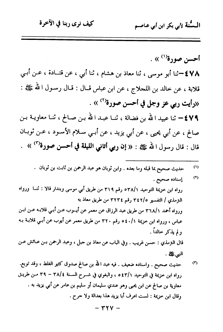 479 - حَدَّثنا عُبَيْدُ اللهِ بْنُ فَضَالَةَ، حَدَّثنا عَبْدُ اللهِ بْنُ صَالِحٍ، حَدَّثنا مُعَاوِيَةُ بْنُ صَالِحٍ، عَنْ أَبِي يَحْيَى، عَنْ أَبِي يَزِيدَ، عَنْ أَبِي سَلاَمٍ الأَسْوَدِ، عَنْ ثَوْبَانَ، قَالَ: قَالَ رَسُولُ اللهِ صَلى الله عَلَيهِ وسَلمَ: إِنَّ رَبِّي أَتَانِي اللَّيْلَةَ فِي أَحْسَنِ صُورَةٍ.