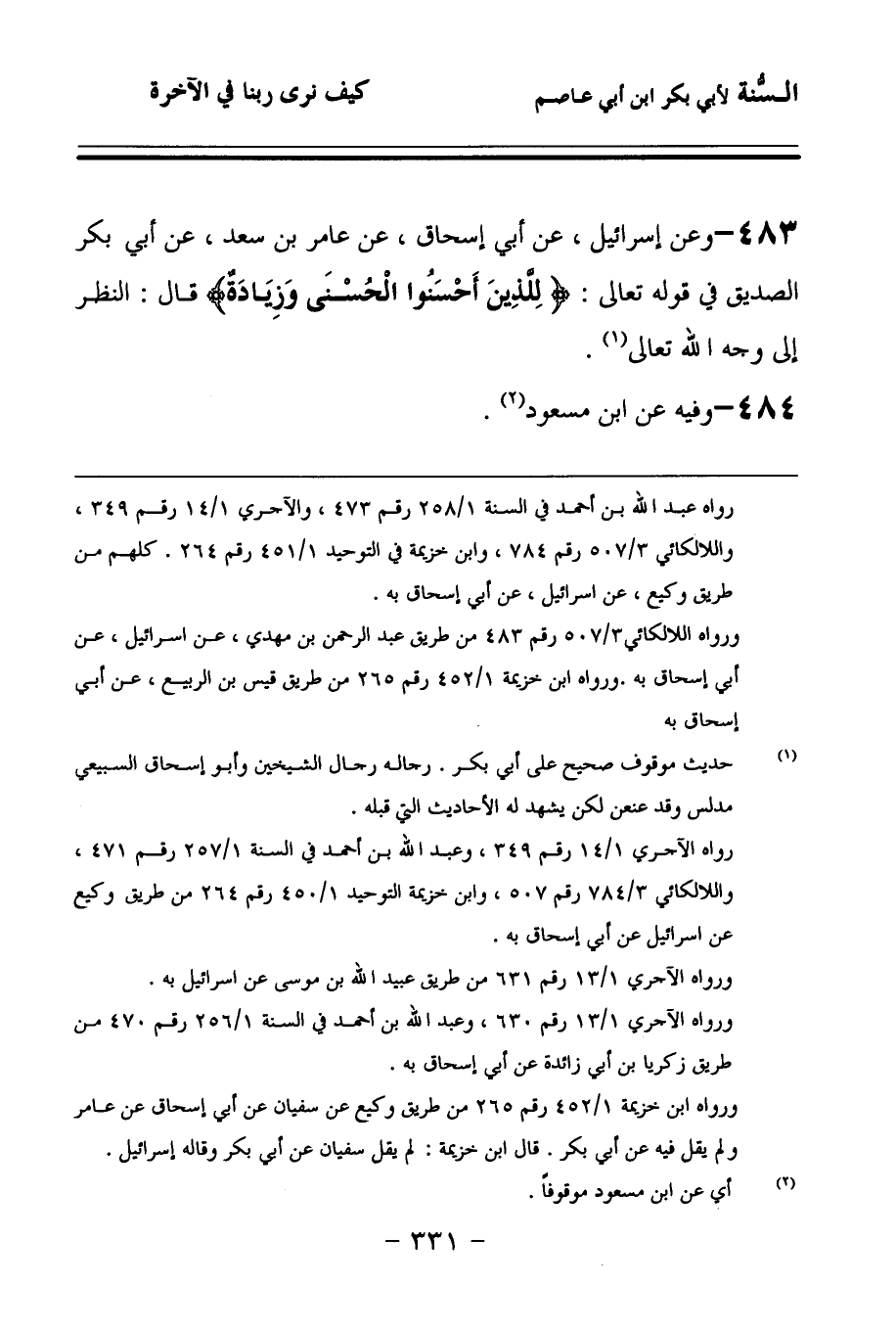 483 - وَعَنْ إِسْرَائِيلَ، عَنْ أَبِي إِسْحَاقَ، عَنْ عَامِرِ بْنِ سَعْدٍ، عَنْ أَبِي بَكْرٍ الصِّدِّيقِ، فِي قَوْلِهِ تَعَالَى: {لِلَّذِينَ أَحْسَنُوا الْحُسْنَى وَزِيَادَةٌ} قَالَ: النَّظَرُ إِلَى وَجْهِ اللهِ تَعَالَى.