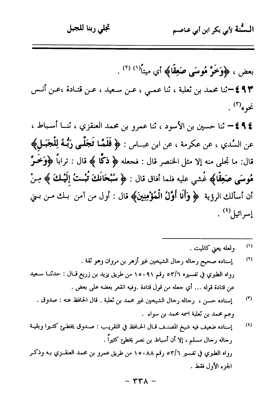 494 - حَدَّثنا حُسَيْنُ بْنُ الأَسْوَدِ، حَدَّثنا عَمْرُو بْنُ مُحَمَّدٍ الْعَنْقَزِيُّ، حَدَّثنا أَسْبَاطٌ، عَنِ السُّدِّيِّ، عَنْ عِكْرِمَةَ، عَنِ ابْنِ عَبَّاسٍ: {فَلَمَّا تَجَلَّى رَبُّهُ لِلْجَبَلِ} قَالَ: مَا تَجَلَّى مِنْهُ إِلاَّ مِثْلُ الْخِنْصَرِ، قَالَ: {فَجَعَلَهُ دَكًّا} قَالَ: تُرَابًا، {وَخَرَّ مُوسَى صَعِقًا} غُشِيَ عَلَيْهِ، {فَلَمَّا أَفَاقَ قَالَ سُبْحَانَكَ تُبْتُ إِلَيْكَ} مِنْ أَنْ أَسْأَلَكَ الرُّؤْيَةَ، {وَأَنَا أَوَّلُ الْمُؤْمِنِينَ} قَالَ: أَوَّلُ مَنْ آمَنَ بِكَ مِنْ بَنِي إِسْرَائِيلَ.