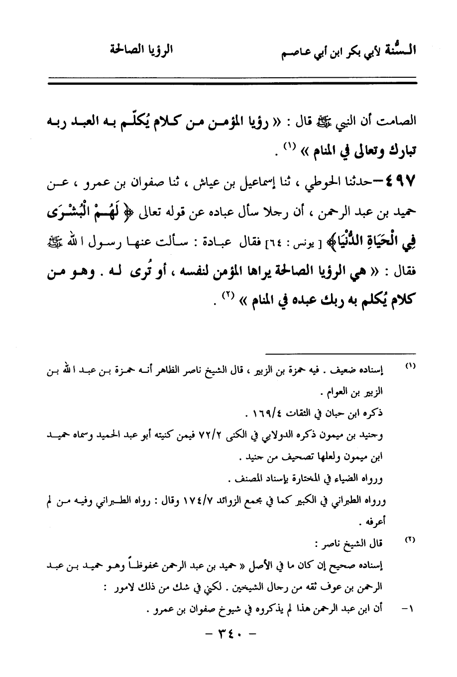 497 - حَدَّثنا الْحَوْطِيُّ، حَدَّثنا إِسْمَاعِيلُ بْنُ عَيَّاشٍ، حَدَّثنا صَفْوَانُ بْنُ عَمْرٍو، عَنْ حُمَيْدِ بْنِ عَبْدِ الرَّحْمَنِ، أَنَّ رَجُلاً سَأَلَ عُبَادَةَ عَنْ قَوْلِهِ تَعَالَى: {لَهُمُ الْبُشْرَى فِي الْحَيَاةِ الدُّنْيَا} فَقَالَ عُبَادَةُ: سَأَلْتُ عَنْهَا رَسُولَ اللهِ صَلى الله عَلَيهِ وسَلمَ فَقَالَ: هِيَ الرُّؤْيَا الصَّالِحَةُ يَرَاهَا الْمُؤْمِنُ لِنَفْسِهِ، أَوْ تُرَى لَهُ، وَهُوَ مِنْ كَلاَمٍ يُكَلِّمُ بِهِ رَبُّكَ عَبْدَهُ فِي الْمَنَامِ.