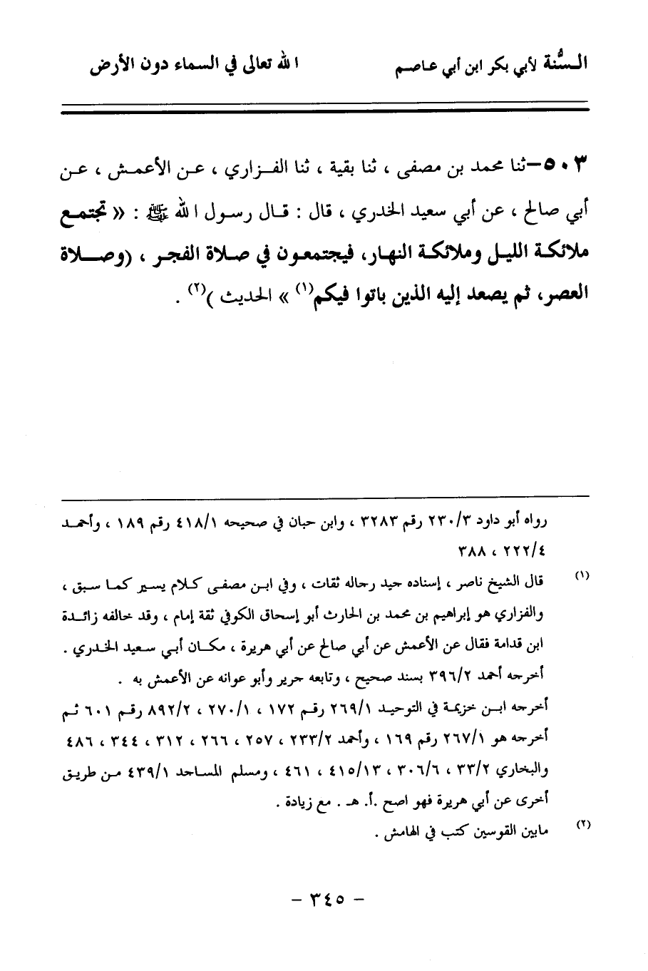 503 - حَدَّثنا مُحَمَّدُ بْنُ مُصَفَّى، حَدَّثنا بَقِيَّةُ، حَدَّثنا الْفَزَارِيُّ، عَنِ الأَعْمَشِ، عَنْ أَبِي صَالِحٍ، عَنْ أَبِي سَعِيدٍ الْخُدْرِيِّ، قَالَ: قَالَ رَسُولُ اللهِ صَلى الله عَلَيهِ وسَلمَ: تَجْتَمِعُ مَلاَئِكَةُ اللَّيْلِ وَمَلاَئِكَةُ النَّهَارِ، فَيَجْتَمِعُونَ فِي صَلاَةِ الْفَجْرِ وَصَلاَةِ الْعَصْرِ، ثُمَّ يَصْعَدُ إِلَيْهِ الَّذِينَ بَاتُوا فِيكُمْ، الْحَدِيثَ.