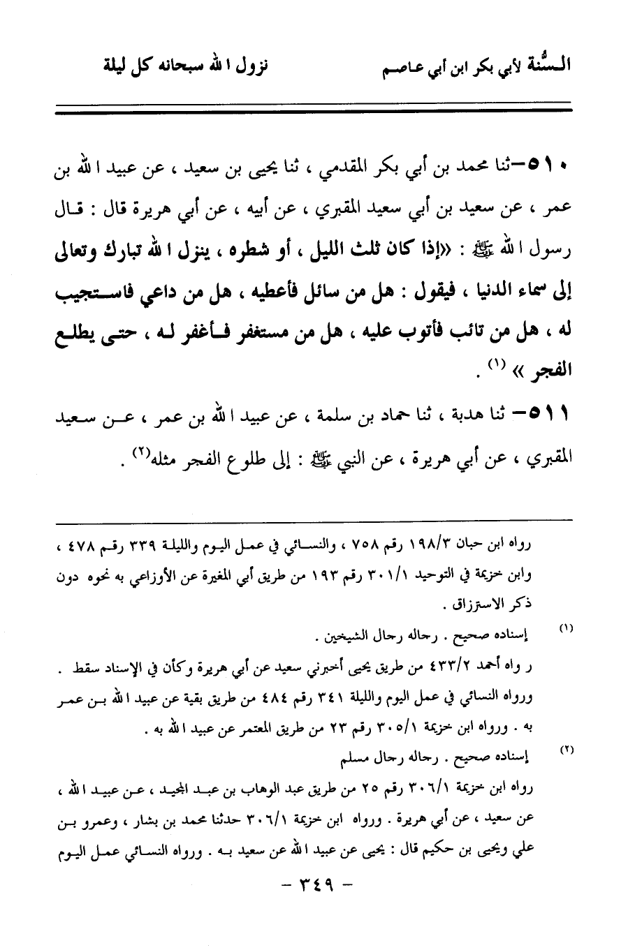 510 - حَدَّثنا مُحَمَّدُ بْنُ أَبِي بَكْرٍ الْمُقَدَّمِيُّ، حَدَّثنا يَحْيَى بْنُ سَعِيدٍ، عَنْ عُبَيْدِ اللهِ بْنِ عُمَرَ، عَنْ سَعِيدِ بْنِ أَبِي سَعِيدٍ الْمَقْبُرِيِّ، عَنْ أَبِيهِ، عَنْ أَبِي هُرَيْرَةَ، قَالَ: قَالَ رَسُولُ اللهِ صَلى الله عَلَيهِ وسَلمَ: إِذَا كَانَ ثُلُثُ اللَّيْلِ, أَوْ شَطْرُهُ يَنْزِلُ اللهُ تَبَارَكَ وَتَعَالَى إِلَى سَمَاءِ الدُّنْيَا, فَيَقُولُ: هَلْ مِنْ سَائِلٍ فَأُعْطِيَهُ؟ هَلْ مِنْ دَاعِي فَأَسْتَجِيبَ لَهُ؟ هَلْ مِنْ تَائِبٍ فَأَتُوبَ عَلَيْهِ؟ هَلْ مِنْ مُسْتَغْفِرٍ فَأَغْفِرَ لَهُ؟ حَتَّى يَطْلُعَ الْفَجْرُ.