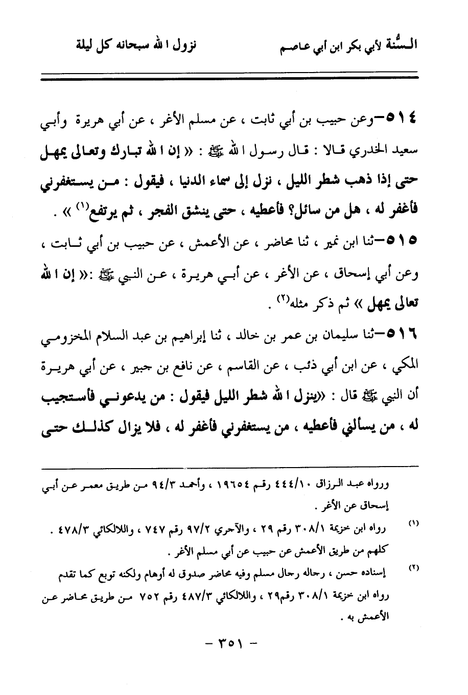 516 - حَدَّثنا سُلَيْمَانُ بْنُ عُمَرَ بْنِ خَالِدٍ، حَدَّثنا إِبْرَاهِيمُ بْنُ عَبْدِ السَّلاَمِ الْمَخْزُومِيُّ الْمَكِّيُّ، عَنِ ابْنِ أَبِي ذِئْبٍ، عَنِ الْقَاسِمِ، عَنْ نَافِعِ بْنِ جُبَيْرٍ، عَنْ أَبِي هُرَيْرَةَ، أَنَّ النَّبِيَّ صَلى الله عَلَيهِ وسَلمَ قَالَ: يَنْزِلُ اللهُ شَطْرَ اللَّيْلِ فَيَقُولُ: مَنْ يَدْعُونِي فَأَسْتَجِيبَ لَهُ؟ مَنْ يَسْأَلُنِي فَأُعْطِيَهُ؟ مَنْ يَسْتَغْفِرُنِي فَأَغْفِرَ لَهُ؟ فَلاَ يَزَالُ كَذَلِكَ حَتَّى تَتَرَجَّلَ الشَّمْسُ.