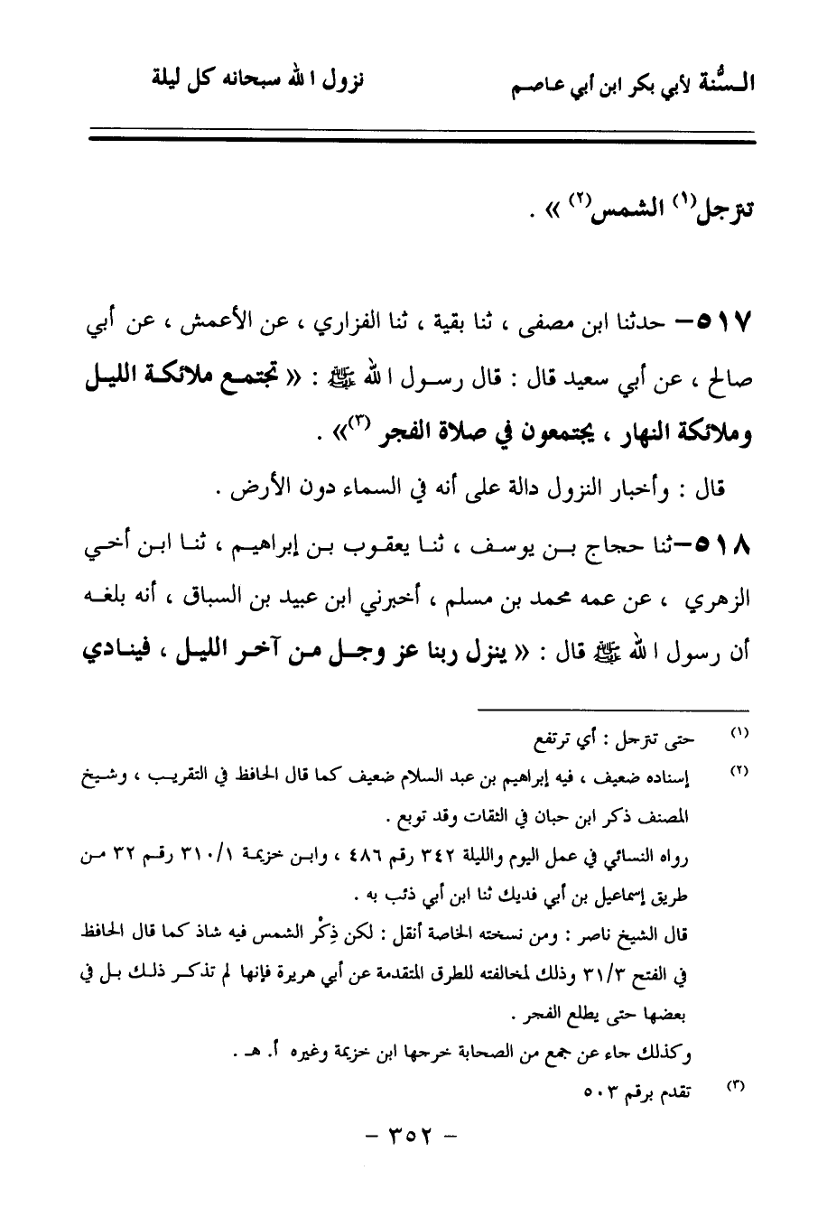 518 - حَدَّثنا حَجَّاجُ بْنُ يُوسُفَ، حَدَّثنا يَعْقُوبُ بْنُ إِبْرَاهِيمَ، حَدَّثنا ابْنُ أَخِي الزُّهْرِيِّ، عَنْ عَمِّهِ مُحَمَّدِ بْنِ مُسْلِمٍ، أَخْبَرَنِي ابْنُ عُبَيْدِ بْنُ السَّبَّاقِ، أَنَّهُ بَلَغَهُ أَنَّ رَسُولَ اللهِ صَلى الله عَلَيهِ وسَلمَ قَالَ: يَنْزِلُ رَبُّنَا عَزَّ وَجَلَّ مِنْ آخِرِ اللَّيْلِ، فَيُنَادِي مُنَادٍ فِي السَّمَاءِ الْعُلْيَا: أَلاَ نَزَلَ الْخَلاَّقُ الْعَلِيمُ، فَيَسْجُدُ أَهْلُ السَّمَاءِ، ثُمَّ يُنَادِي فِيهِمْ مُنَادِي بِذَلِكَ، فَلاَ يَمُرُّ بِأَهْلِ سَمَاءٍ إِلاَّ وَهُمْ سُجُودٌ.