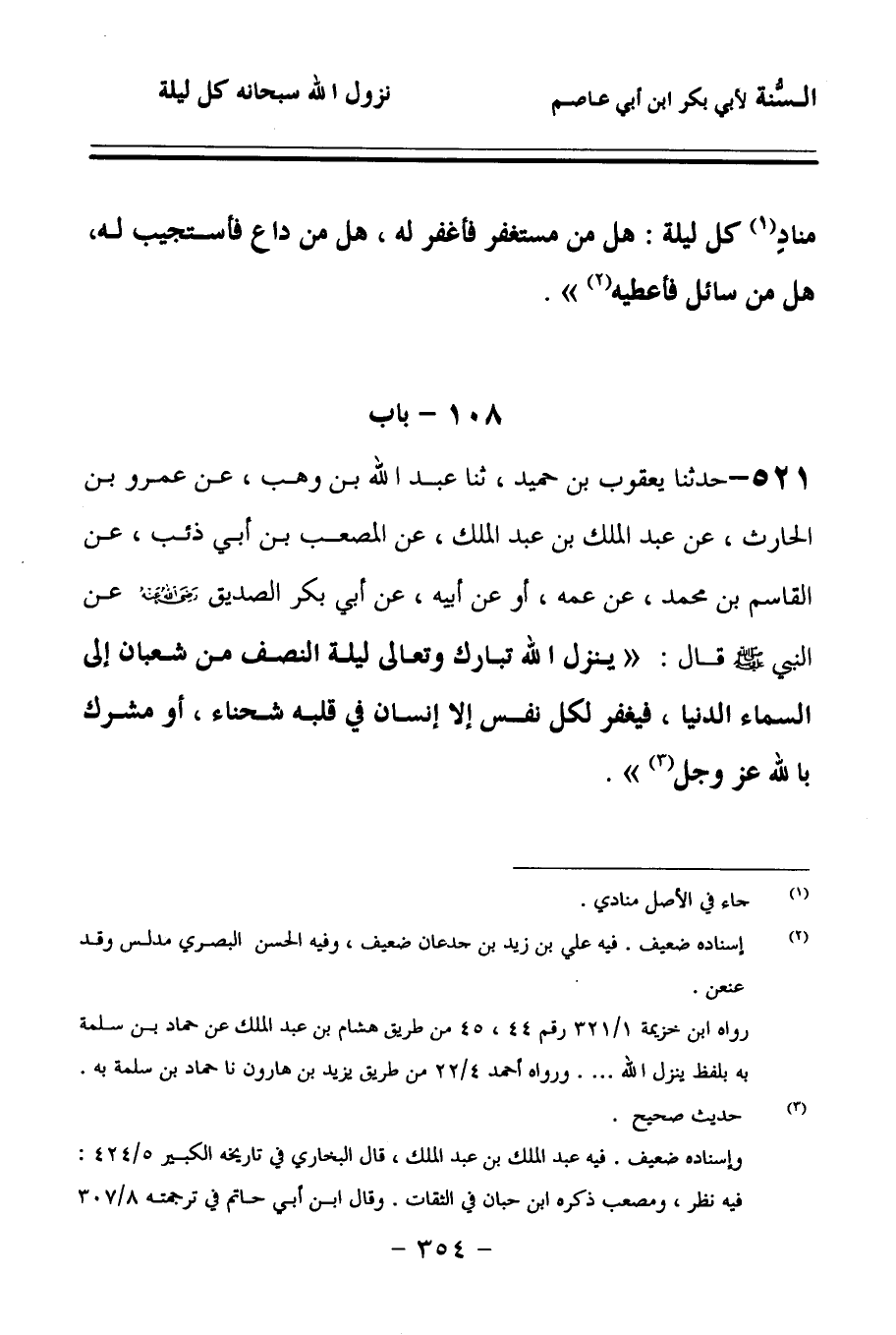 521 - حَدَّثنا يَعْقُوبُ بْنُ حُمَيْدٍ، حَدَّثنا عَبْدُ اللهِ بْنُ وَهْبٍ، عَنْ عَمْرِو بْنِ الْحَارِثِ، عَنْ عَبْدِ الْمَلِكِ بْنِ عَبْدِ الْمَلِكِ، عَنِ الْمُصْعَبِ بْنِ أَبِي ذِئْبٍ، عَنِ الْقَاسِمِ بْنِ مُحَمَّدٍ، عَنْ عَمِّهِ، أَوْ عَنْ أَبِيهِ، عَنْ أَبِي بَكْرٍ الصِّدِّيقِ، رَضِيَ اللهُ عَنْهُ، عَنِ النَّبِيِّ صَلى الله عَلَيهِ وسَلمَ قَالَ: يَنْزِلُ اللهُ تَبَارَكَ وَتَعَالَى لَيْلَةَ النِّصْفِ مِنْ شَعْبَانَ إِلَى السَّمَاءِ الدُّنْيَا، فَيَغْفِرُ لِكُلِّ نَفْسٍ؛ إِلاَّ إِنْسَانٍ فِي قَلْبِهِ شَحْنَاءٌ، أَوْ مُشْرِكٍ بِاللهِ عَزَّ وَجَلَّ.