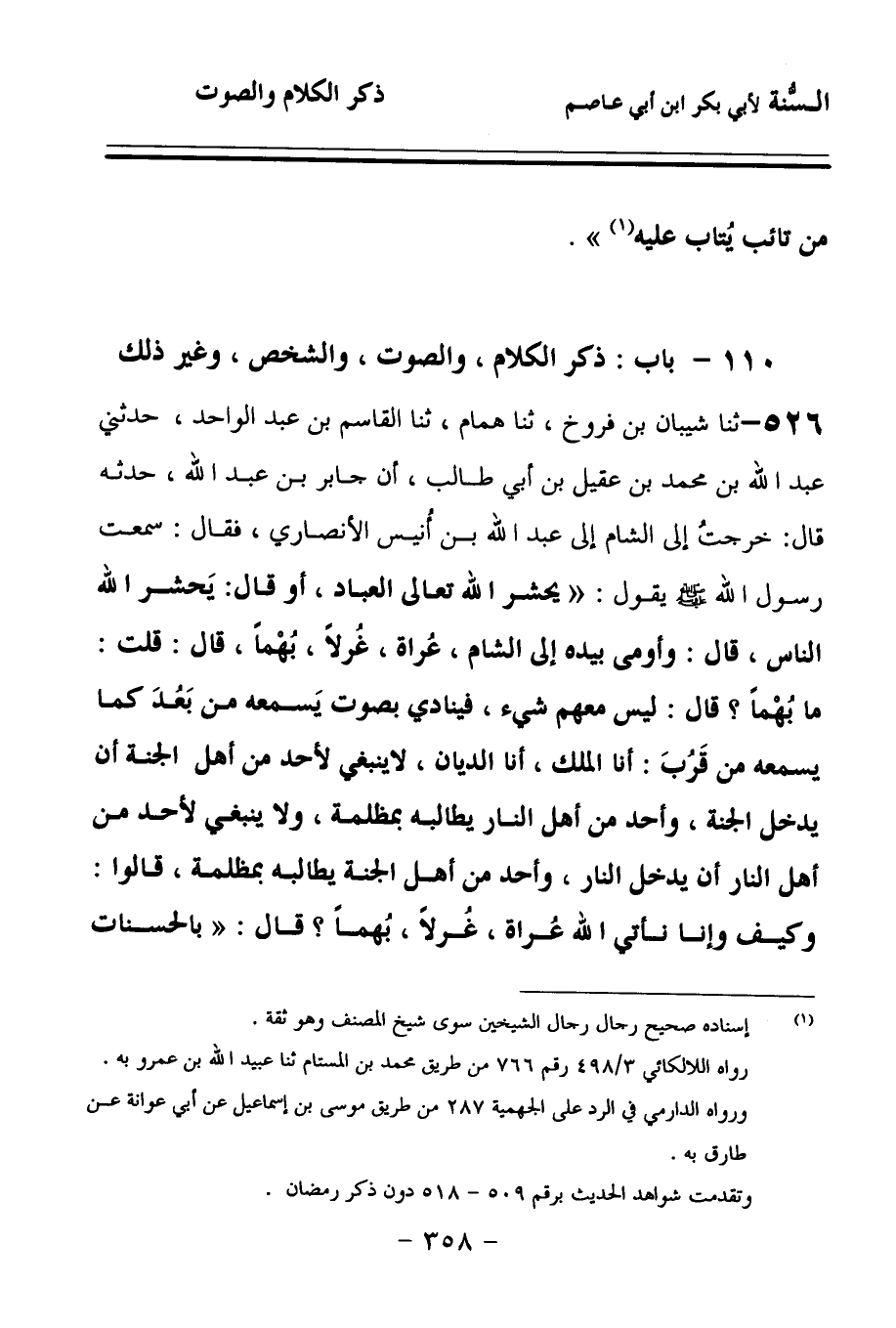 526 - حَدَّثنا شَيْبَانُ بْنُ فَرُّوخَ، حَدَّثنا هَمَّامٌ، حَدَّثنا الْقَاسِمُ بْنُ عَبْدِ الْوَاحِدِ، حَدَّثَنِي عَبْدُ اللهِ بْنُ مُحَمَّدِ بْنِ عَقِيلِ بْنِ أَبِي طَالِبٍ، أَنَّ جَابِرَ بْنَ عَبْدِ اللهِ حَدَّثَهُ، قَالَ: خَرَجْتُ إِلَى الشَّامِ إِلَى عَبْدِ اللهِ بْنِ أُنَيْسٍ الأَنْصَارِيِّ، فَقَالَ: سَمِعْتُ رَسُولَ اللهِ صَلى الله عَلَيهِ وسَلمَ يَقُولُ: يَحْشُرُ اللهُ تَعَالَى الْعِبَادَ, أَوْ قَالَ: يَحْشُرُ اللهُ النَّاسَ, قَالَ: وَأَوْمَى بِيَدِهِ إِلَى الشَّامِ، عُرَاةً غُرْلاً بُهْمًا، قَالَ: قُلْتُ: مَا بُهْمًا؟ قَالَ: لَيْسَ مَعَهُمْ شَيْءٌ، فَيُنَادِي بِصَوْتٍ يَسْمَعُهُ مَنْ بَعُدَ كَمَا يَسْمَعُهُ مَنْ قَرُبَ: أَنَا الْمَلِكُ، أَنَا الدَّيَّانُ، لاَ يَنْبَغِي لأَحَدٍ مِنْ أَهْلِ الْجَنَّةِ أَنْ يَدْخُلَ الْجَنَّةَ وَأَحَدٌ مِنْ أَهْلِ النَّارِ يُطَالِبُهُ بِمَظْلَمَةٍ، وَلاَ يَنْبَغِي لأَحَدٍ مِنْ أَهْلِ النَّارِ أَنْ يَدْخُلَ النَّارَ وَأَحَدٌ مِنْ أَهْلِ الْجَنَّةِ يُطَالِبُهُ بِمَظْلَمَةٍ، قَالُوا: وَكَيْفَ وَإِنَّا نَأْتِي اللهَ عُرَاةً غُرْلاً بُهْمًا؟ قَالَ: بِالْحَسَنَاتِ وَالسَّيِّئَاتِ.