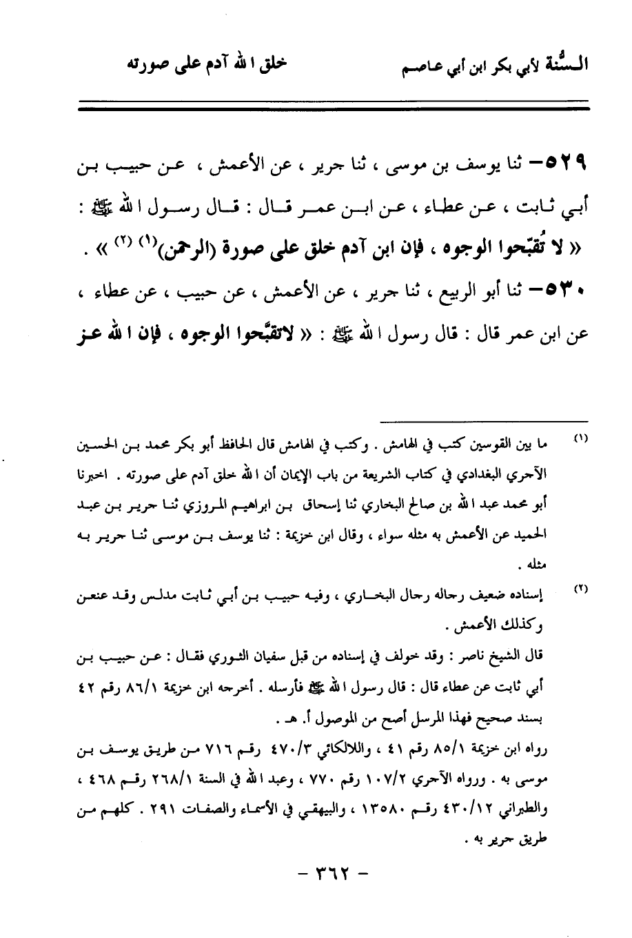 530 - حَدَّثنا أَبُو الرَّبِيعِ، حَدَّثنا جَرِيرٌ، عَنِ الأَعْمَشِ، عَنْ حَبِيبٍ، عَنْ عَطَاءٍ، عَنِ ابْنِ عُمَرَ، قَالَ: قَالَ رَسُولُ اللهِ صَلى الله عَلَيهِ وسَلمَ: لاَ تُقَبِّحُوا الْوُجُوهَ، فَإِنَّ اللهَ عَزَّ وَجَلَّ خَلَقَ آدَمَ عَلَى صُورَتِهِ.