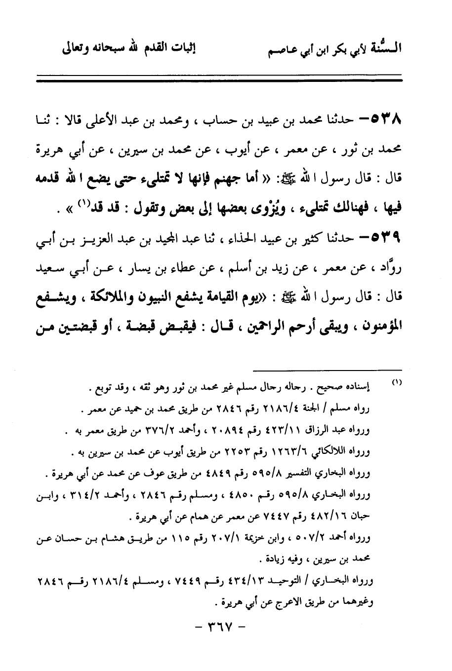 538 - حَدَّثنا مُحَمَّدُ بْنُ عُبَيْدِ بْنِ حِسَابٍ، وَمُحَمَّدُ بْنُ عَبْدِ الأَعْلَى، قَالاَ: حَدَّثنا مُحَمَّدُ بْنُ ثَوْرٍ، عَنْ مَعْمَرٍ، عَنْ أَيُّوبَ، عَنْ مُحَمَّدِ بْنِ سِيرِينَ، عَنْ أَبِي هُرَيْرَةَ، قَالَ: قَالَ رَسُولُ اللهِ صَلى الله عَلَيهِ وسَلمَ: أَمَّا جَهَنَّمُ فَإِنَّهَا لاَ تَمْتَلِيءُ, حَتَّى يَضَعَ اللهُ قَدَمَهُ فِيهَا، فَهُنَالِكَ تَمْتَلِيءُ وَيُزْوَى بَعْضُهَا إِلَى بَعْضٍ، وَتَقُولُ: قَدْ قَدْ.