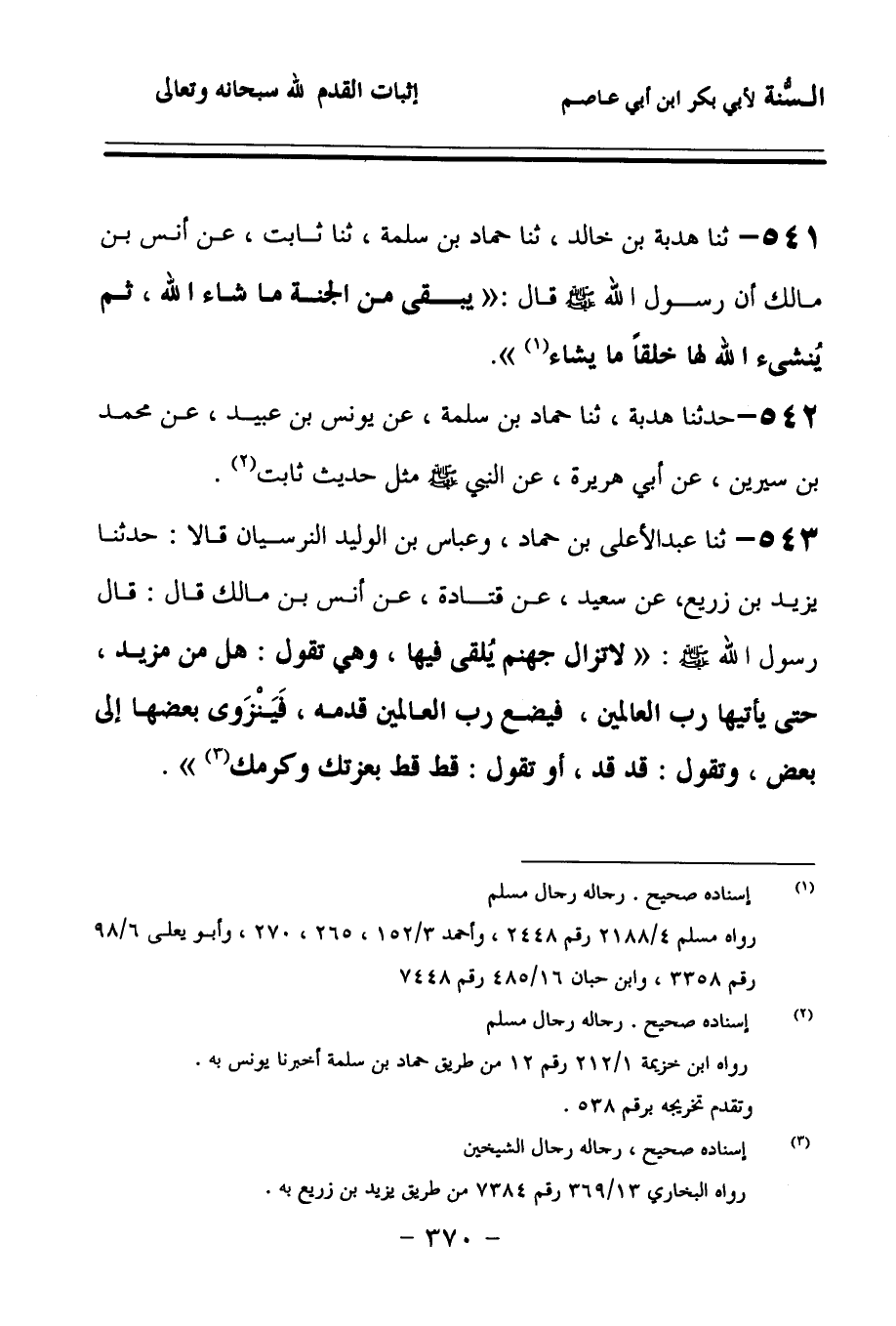 543 - حَدَّثنا عَبْدُ الأَعْلَى بْنُ حَمَّادٍ، وَعَبَّاسُ بْنُ الْوَلِيدِ النَّرْسِيَّانِ، قَالاَ: حَدَّثنا يَزِيدُ بْنُ زُرَيْعٍ، عَنْ سَعِيدٍ، عَنْ قَتَادَةَ، عَنْ أَنَسِ بْنِ مَالِكٍ، قَالَ: قَالَ رَسُولُ اللهِ صَلى الله عَلَيهِ وسَلمَ: لاَ تَزَالُ جَهَنَّمُ يُلْقَى فِيهَا وَهِيَ تَقُولُ: {هَلْ مِنْ مَزِيدٍ} حَتَّى يَأْتِيَهَا رَبُّ الْعَالَمِينَ، فَيَضَعَ رَبُّ الْعَالَمِينَ قَدَمَهُ، فَيَنْزَوِي بَعْضُهَا إِلَى بَعْضٍ, وَتَقُولُ: قَدْ قَدْ، أَوْ تَقُولُ: قَطْ قَطْ، بِعِزَّتِكَ وَكَرَمِكَ.
