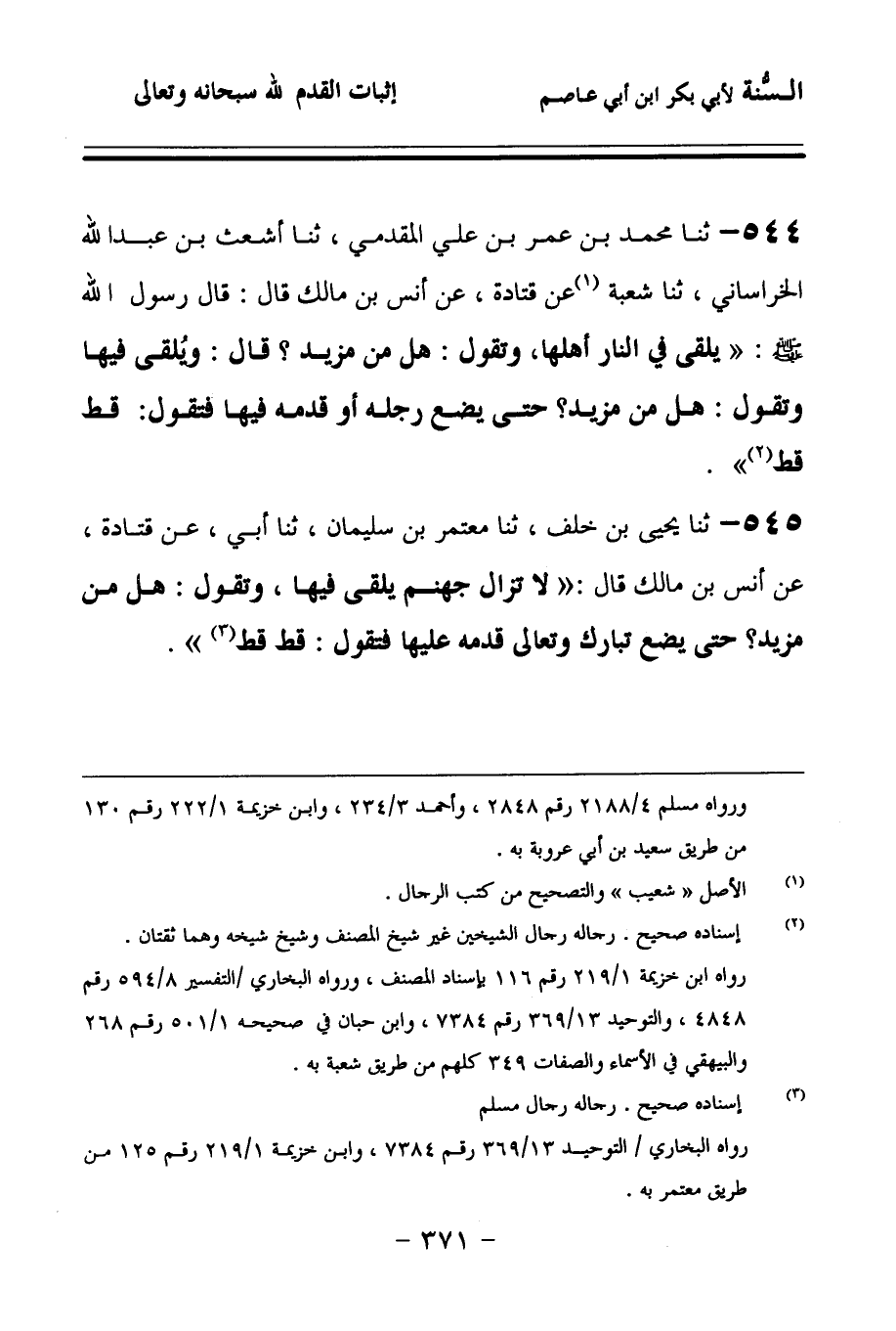 545 - حَدَّثنا يَحْيَى بْنُ خَلَفٍ، حَدَّثنا مُعْتَمِرُ بْنُ سُلَيْمَانَ، حَدَّثنا أَبِي، عَنْ قَتَادَةَ، عَنْ أَنَسِ بْنِ مَالِكٍ، قَالَ: لاَ تَزَالُ جَهَنَّمُ يُلْقَى فِيهَا وَتَقُولُ: {هَلْ مِنْ مَزِيدٍ} حَتَّى يَضَعَ تَبَارَكَ وَتَعَالَى قَدَمَهُ عَلَيْهَا، فَتَقُولُ: قَطْ قَطْ.