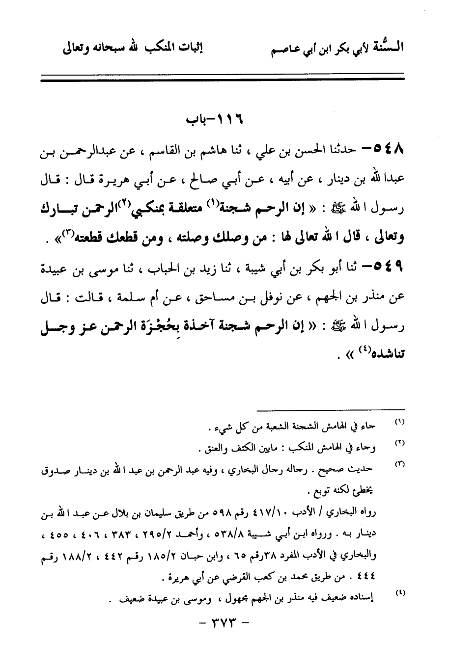 549 - حَدَّثنا أَبُو بَكْرِ بْنُ أَبِي شَيْبَةَ، حَدَّثنا زَيْدُ بْنُ الْحُبَابِ، حَدَّثنا مُوسَى بْنُ عُبَيْدَةَ، عَنْ مُنْذِرِ بْنِ الْجَهْمِ، عَنْ نَوْفَلِ بْنِ مُسَاحِقٍ، عَنْ أُمِّ سَلَمَةَ، قَالَتْ: قَالَ رَسُولُ اللهِ صَلى الله عَلَيهِ وسَلمَ: إِنَّ الرَّحِمَ شَجْنَةٌ آخِذَةٌ بِحُجْزَةِ الرَّحْمَنِ عَزَّ وَجَلَّ تُنَاشِدُهُ.