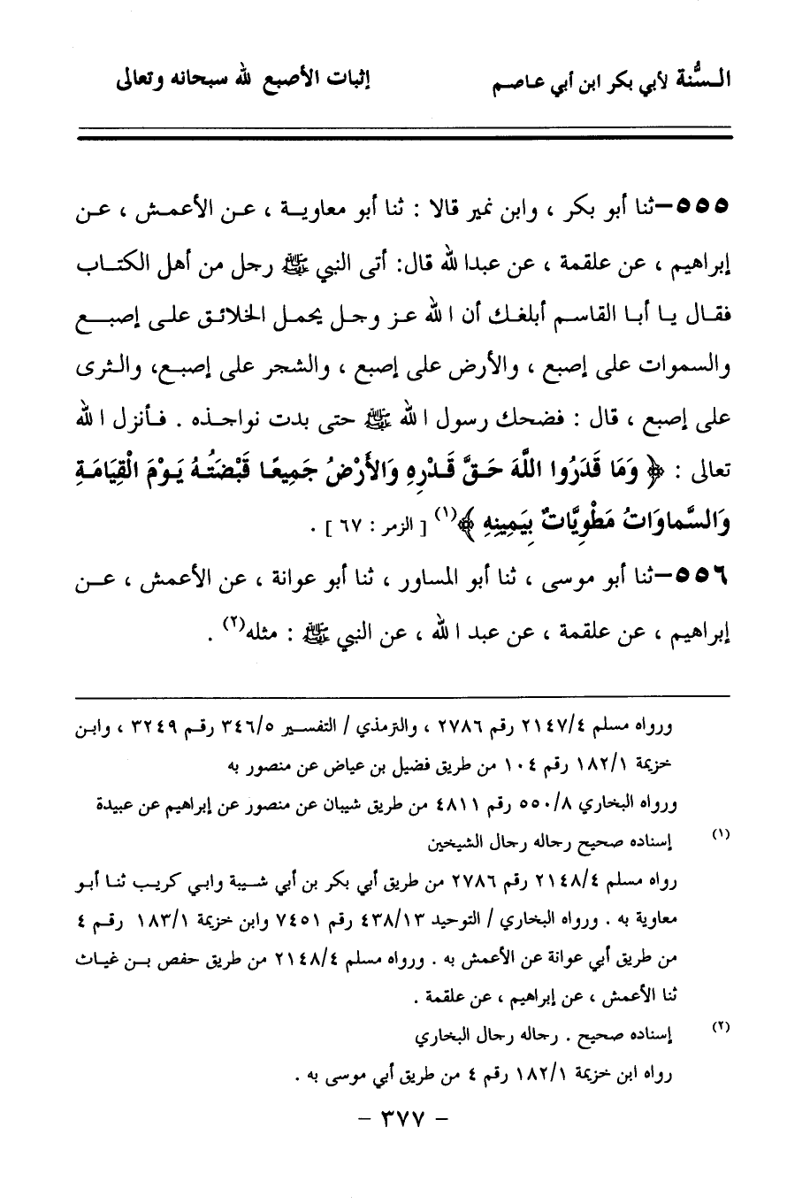 555 - حَدَّثنا أَبُو بَكْرٍ، وَابْنُ نُمَيْرٍ، قَالاَ: حَدَّثنا أَبُو مُعَاوِيَةَ، عَنِ الأَعْمَشِ، عَنْ إِبْرَاهِيمَ، عَنْ عَلْقَمَةَ، عَنْ عَبْدِ اللهِ، قَالَ: أَتَى النَّبِيَّ صَلى الله عَلَيهِ وسَلمَ رَجُلٌ مِنْ أَهْلِ الْكِتَابِ, فَقَالَ: يَا أَبَا الْقَاسِمِ, أَبَلَغَكَ أَنَّ اللهَ عَزَّ وَجَلَّ يَحْمِلُ الْخَلاَئِقَ عَلَى إِصْبَعٍ، وَالسَّمَاوَاتِ عَلَى إِصْبَعٍ، وَالأَرْضَ عَلَى إِصْبَعٍ، وَالشَّجَرَ عَلَى إِصْبَعٍ، وَالثَّرَى عَلَى إِصْبَعٍ، قَالَ: فَضَحِكَ رَسُولُ اللهِ صَلى الله عَلَيهِ وسَلمَ حَتَّى بَدَتْ نَوَاجِذُهُ، فَأَنْزَلَ اللهُ تَعَالَى: {وَمَا قَدَرُوا اللهَ حَقَّ قَدْرِهِ وَالأَرْضُ جَمِيعًا قَبْضَتُهُ يَوْمَ الْقِيَامَةِ وَالسَّمَاوَاتُ مَطْوِيَّاتٌ بِيَمِينِهِ}.