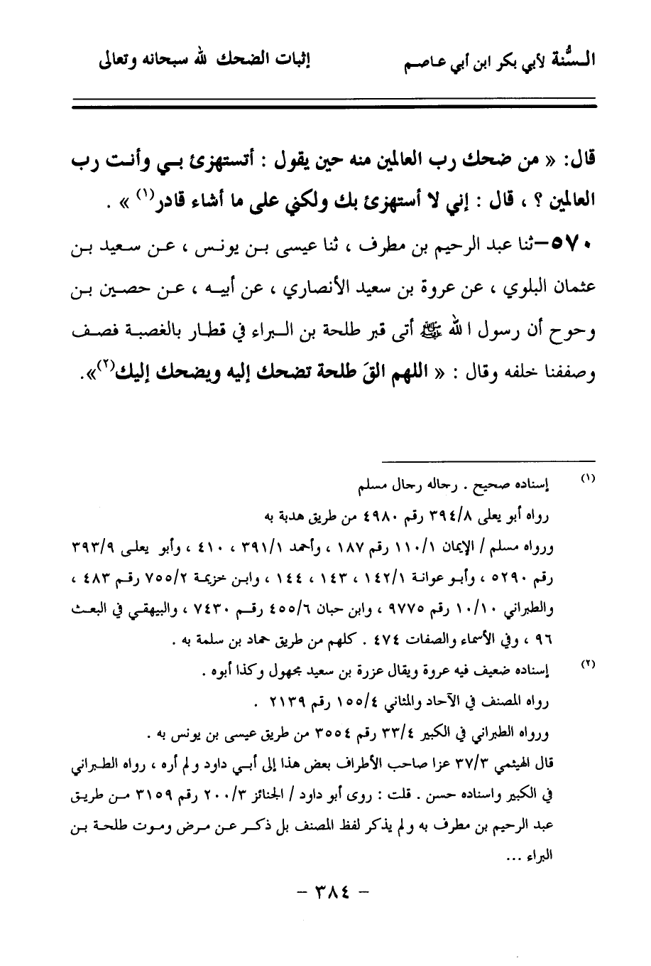 570 - حَدَّثنا عَبْدُ الرَّحِيمِ بْنُ مُطَرِّفٍ، حَدَّثنا عِيسَى بْنُ يُونُسَ، عَنْ سَعِيدِ بْنِ عُثْمَانَ الْبَلَوِيِّ، عَنْ عُرْوَةَ بْنِ سَعِيدٍ الأَنْصَارِيِّ، عَنْ أَبِيهِ، عَنْ حُصَيْنِ بْنِ وَحْوَحٍ، أَنَّ رَسُولَ اللهِ صَلى الله عَلَيهِ وسَلمَ أَتَى قَبْرَ طَلْحَةَ بْنِ الْبَرَاءِ فِي قِطَارٍ بِالْغَصْبَةِ، فَصَفَّ وَصَفَفْنَا خَلْفَهُ, وَقَالَ: اللهُمَّ الْقَ طَلْحَةَ تَضَحَكُ إِلَيْهِ، وَيَضْحَكُ إِلَيْكَ.