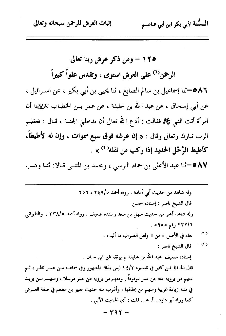 586 - حَدَّثنا إِسْمَاعِيلُ بْنُ سَالِمٍ الصَّايِغُ، حَدَّثنا يَحْيَى بْنُ أَبِي بُكَيْرٍ، عَنْ إِسْرَائِيلَ، عَنْ أَبِي إِسْحَاقَ، عَنْ عَبْدِ اللهِ بْنِ خَلِيفَةَ، عَنْ عُمَرَ بْنِ الْخَطَّابِ، رَضِيَ اللهُ عَنْهُ، أَنَّ امْرَأَةً أَتَتِ النَّبِيَّ صَلى الله عَلَيهِ وسَلمَ فَقَالَتْ: ادْعُ اللهَ تَعَالَى أَنْ يُدْخِلَنِي الْجَنَّةَ، قَالَ: فَعَظَّمَ الرَّبَّ تَبَارَكَ وَتَعَالَى, وَقَالَ: إِنَّ عَرْشَهُ فَوْقَ سَبْعِ سَمَاوَاتٍ، وَإِنَّ لَهُ لأَطِيطًا كَأَطِيطِ الرَّحْلِ الْحَدِيدِ إِذَا رُكِبَ مِنْ ثِقَلِهِ.