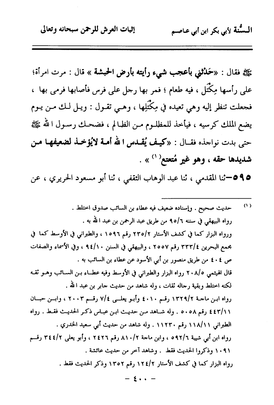 595 - حَدَّثنا الْمُقَدَّمِيُّ، حَدَّثنا عَبْدُ الْوَهَّابِ الثَّقَفِيُّ، حَدَّثنا أَبُو مَسْعُودٍ الْجُرَيْرِيُّ (1)، عَنْ رَجُلٍ، عَنِ ابْنِ شِغَافٍ (2)، عَنْ عَبْدِ اللهِ بْنِ سَلاَمٍ، قَالَ: وَالَّذِي نَفْسِي بِيَدِهِ، إِنَّ أَقْرَبَ النَّاسِ يَوْمَ الْقِيَامَةِ مُحَمَّدٌ صَلى الله عَلَيهِ وسَلمَ، جَالِسٌ عَنْ يَمِينِهِ عَلَى الْكُرْسِيٍّ.