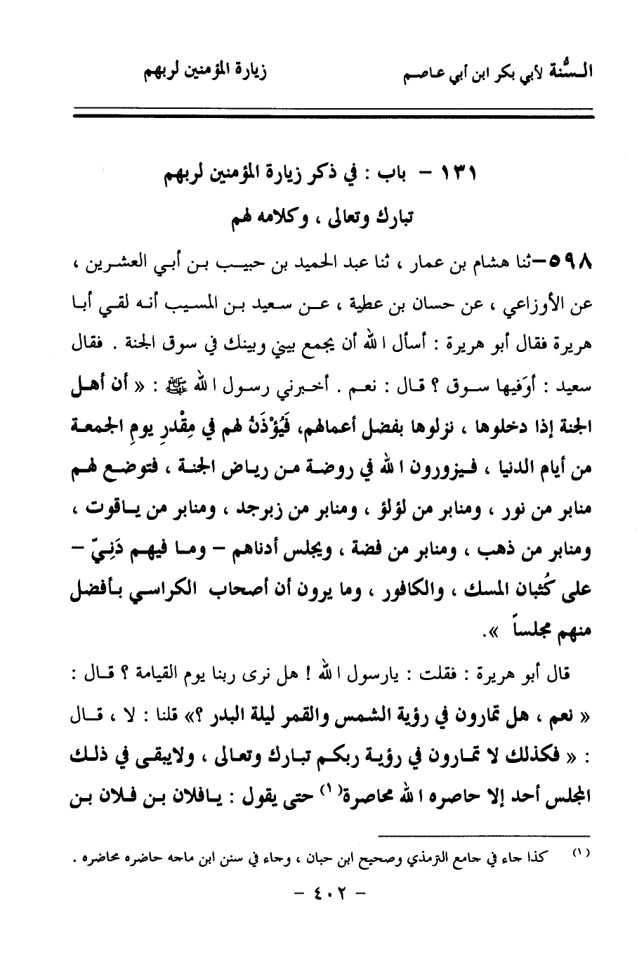 598 - حَدَّثنا هِشَامُ بْنُ عَمَّارٍ، حَدَّثنا عَبْدُ الْحَمِيدِ بْنُ حَبِيبِ بْنِ أَبِي الْعِشْرِينَ، عَنِ الأَوْزَاعِيِّ، عَنْ حَسَّانَ بْنِ عَطِيَّةَ، عَنْ سَعِيدِ بْنِ الْمُسَيِّبِ، أَنَّهُ لَقِيَ أَبَا هُرَيْرَةَ، فَقَالَ أَبُو هُرَيْرَةَ: أَسْأَلُ اللهَ أَنْ يَجْمَعَ بَيْنِي وَبَيْنَكَ فِي سُوقِ الْجَنَّةِ، فَقَالَ سَعِيدٌ: أَوَفِيهَا سُوقٌ؟ قَالَ: نَعَمْ، أَخْبَرَنِي رَسُولُ اللهِ صَلى الله عَلَيهِ وسَلمَ: أَنَّ أَهْلَ الْجَنَّةِ إِذَا دَخَلُوهَا, نَزَلُوهَا بِفَضْلِ أَعْمَالِهِمْ، فَيُؤَذَنُ لَهُمْ فِي مِقْدَارِ يَوْمِ الْجُمُعَةِ مِنْ أَيَّامِ الدُّنْيَا, فَيَزُورُونَ اللهَ فِي رَوْضَةٍ مِنْ رِيَاضِ الْجَنَّةِ، فَتُوضَعُ لَهُمْ مَنَابِرُ مِنْ نُورٍ، وَمَنَابِرُ مِنْ لُؤْلُؤٍ، وَمَنَابِرُ مِنْ زَبَرْجَدٍ، وَمَنَابِرُ مِنْ يَاقُوتٍ، وَمَنَابِرُ مِنْ ذَهَبٍ، وَمَنَابِرُ مِنْ فِضَّةٍ، وَيَجْلِسُ أَدْنَاهُمْ، وَمَا فِيهِمْ دَنِيٌّ، عَلَى كُثْبَانِ الْمِسْكِ وَالْكَافُورِ، وَمَا يَرَوْنَ أَنَّ أَصْحَابَ الْكَرَاسِيِّ بِأَفْضَلَ مِنْهُمْ مَجْلِسًا، قَالَ أَبُو هُرَيْرَةَ: فَقُلْتُ: يَا رَسُولَ اللهِ, هَلْ نَرَى رَبَّنَا يَوْمَ الْقِيَامَةِ؟ قَالَ: نَعَمْ، هَلْ تُمَارُونَ فِي رُؤْيَةِ الشَّمْسِ وَالْقَمَرِ لَيْلَةَ الْبَدْرِ؟ قُلْنَا: لاَ، قَالَ: فَكَذَلِكَ لاَ تُمَارُونَ فِي رُؤْيَةِ رَبِّكُمْ تَبَارَكَ وَتَعَالَى، وَلاَ يَبْقَى فِي ذَلِكَ الْمَجْلِسِ أَحَدٌ إِلاَّ حَاصَرَهُ اللهُ مُحَاصَرَةً (1)، حَتَّى يَقُولَ: يَا فُلاَنُ بْنَ فُلاَنِ بْنِ فُلاَنٍ, أَتَذْكُرُ يَوْمَ فَعَلْتَ كَذَا وَكَذَا،