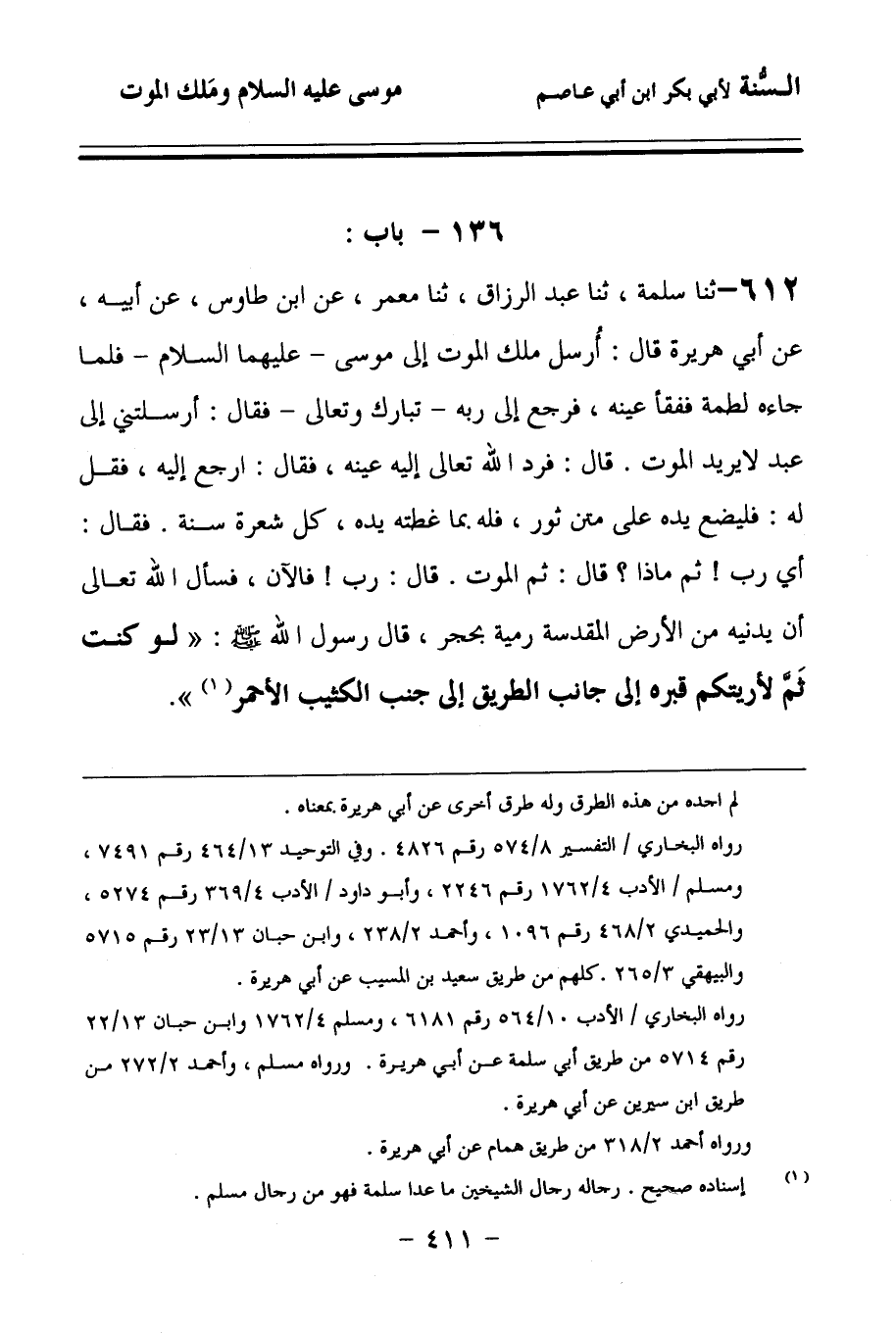 612 - حَدَّثنا سَلَمَةُ، حَدَّثنا عَبْدُ الرَّزَّاقِ، حَدَّثنا مَعْمَرٌ، عَنِ ابْنِ طَاوُوسٍ، عَنْ أَبِيهِ، عَنْ أَبِي هُرَيْرَةَ، قَالَ: أُرْسِلَ مَلَكُ الْمَوْتِ إِلَى مُوسَى عَلَيْهِمَا السَّلاَمُ، فَلَمَّا جَاءَهُ لَطَمَهُ, فَفَقَأَ عَيْنَهُ، فَرَجَعَ إِلَى رَبِّهِ تَبَارَكَ وَتَعَالَى، فَقَالَ: أَرْسَلْتَنِي إِلَى عَبْدٍ لاَ يُرِيدُ الْمَوْتَ، قَالَ: فَرَدَّ اللهُ تَعَالَى إِلَيْهِ عَيْنَهُ، فَقَالَ: ارْجِعْ إِلَيْهِ, فَقُلْ لَهُ: فَلْيَضَعْ يَدَهُ عَلَى مَتْنِ ثَوْرٍ، فَلَهُ بِمَا غَطَّتْهُ يَدُهُ، كُلُّ شَعْرَةٍ سَنَةٌ، فَقَالَ: أَيْ رَبِّ, ثُمَّ مَاذَا؟ قَالَ: ثُمَّ الْمَوْتُ، قَالَ: رَبِّ فَالآنَ، فَسَأَلَ اللهَ تَعَالَى أَنْ يُدْنِيَهُ مِنَ الأَرْضِ الْمُقَدَّسَةِ رَمْيَةً بِحَجَرٍ، قَالَ رَسُولُ اللهِ صَلى الله عَلَيهِ وسَلمَ: لَوْ كُنْتُ ثَمَّ لأَرَيْتُكُمْ قَبْرَهُ إِلَى جَانِبِ الطَّرِيقِ, إِلَى جَنْبِ الْكَثِيبِ الأَحْمَرِ.