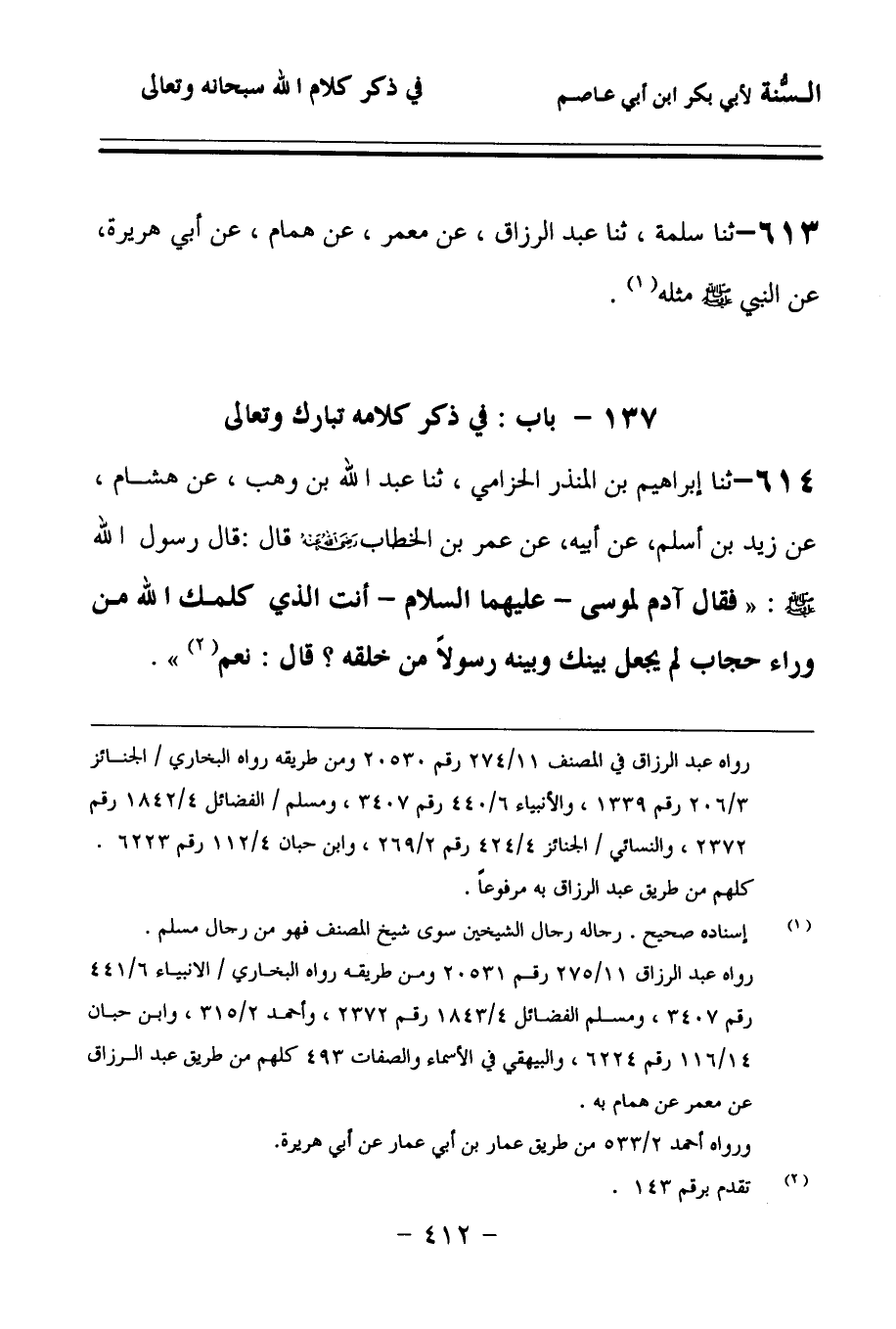 614 - حَدَّثنا إِبْرَاهِيمُ بْنُ الْمُنْذِرِ الْحِزَامِيُّ، حَدَّثنا عَبْدُ اللهِ بْنُ وَهْبٍ، عَنْ هِشَامٍ، عَنْ زَيْدِ بْنِ أَسْلَمَ، عَنْ أَبِيهِ، عَنْ عُمَرَ بْنِ الْخَطَّابِ، رَضِيَ اللهُ عَنْهُ، قَالَ: قَالَ رَسُولُ اللهِ صَلى الله عَلَيهِ وسَلمَ: فَقَالَ آدَمُ لِمُوسَى عَلَيْهِمَا السَّلاَمُ: أَنْتَ الَّذِي كَلَّمَكَ اللهُ مِنْ وَرَاءِ حِجَابٍ، لَمْ يَجْعَلْ بَيْنَكَ وَبَيْنَهُ رَسُولاً مِنْ خَلْقِهِ؟ قَالَ: نَعَمْ.