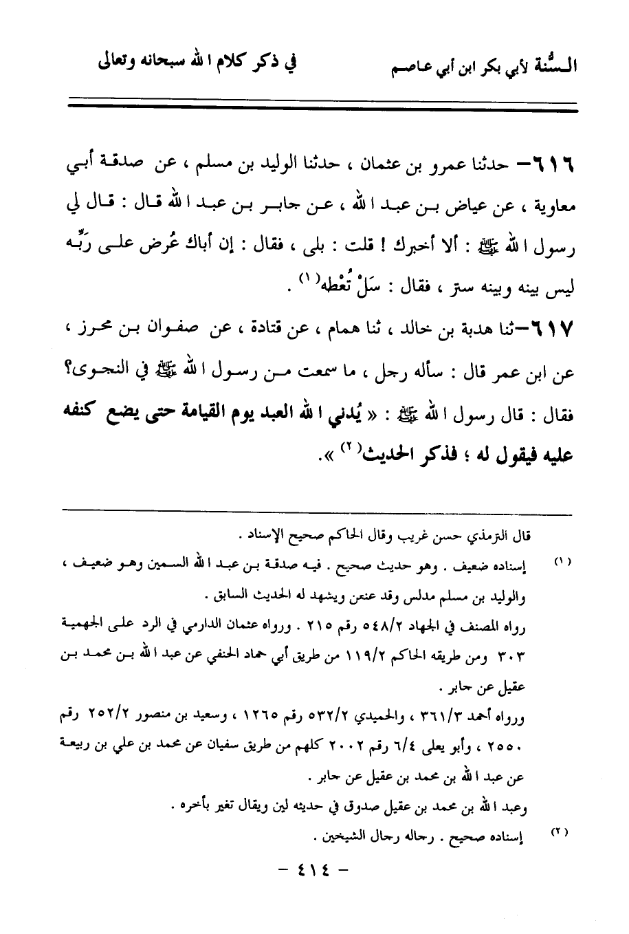 617 - حَدَّثنا هُدْبَةُ بْنُ خَالِدٍ، حَدَّثنا هَمَّامٌ، عَنْ قَتَادَةَ، عَنْ صَفْوَانَ بْنِ مُحْرِزٍ، عَنِ ابْنِ عُمَرَ، قَالَ: سَأَلَهُ رَجُلٌ: مَا سَمِعْتَ مِنْ رَسُولِ اللهِ صَلى الله عَلَيهِ وسَلمَ فِي النَّجْوَى؟ فَقَالَ: قَالَ رَسُولُ اللهِ صَلى الله عَلَيهِ وسَلمَ: يُدْنِي اللهُ الْعَبْدَ يَوْمَ الْقِيَامَةِ حَتَّى يَضَعَ كَنَفَهُ عَلَيْهِ, فَيَقُولُ لَهُ، فَذَكَرَ الْحَدِيثَ.