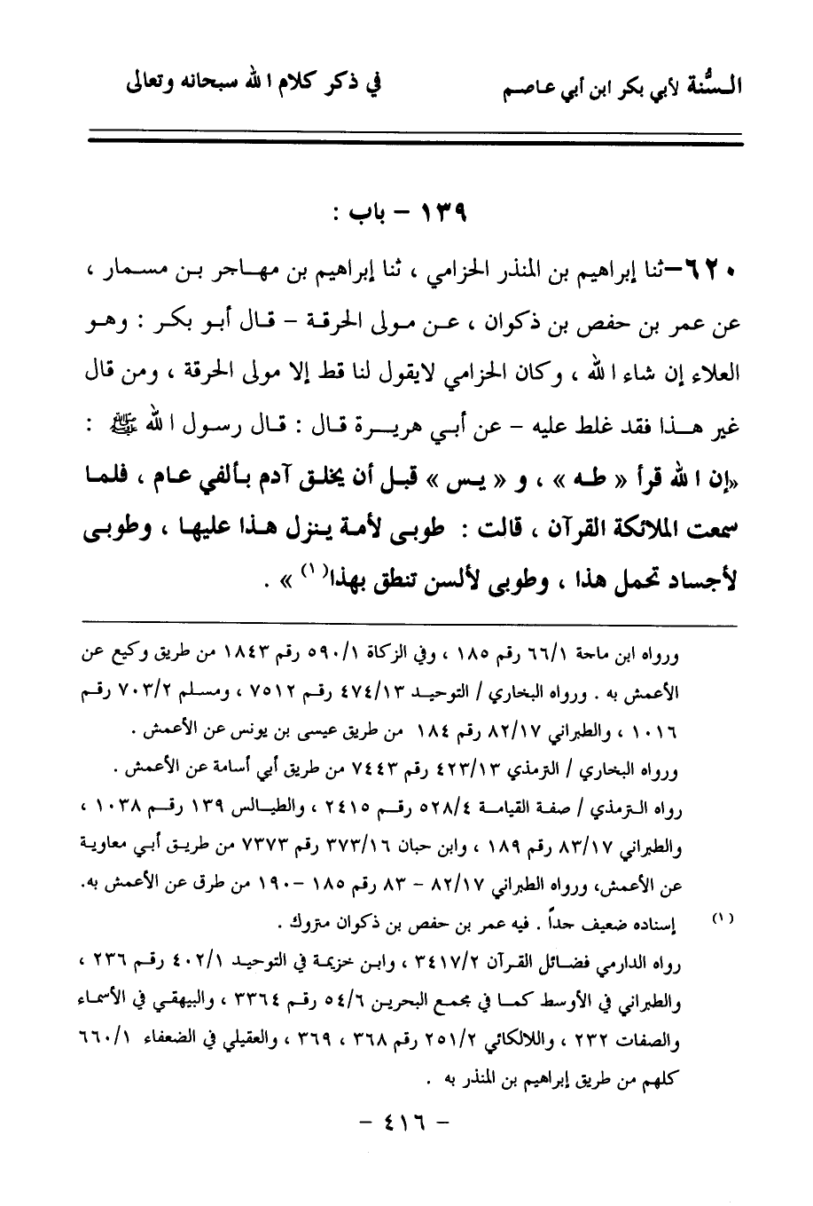 620 - حَدَّثنا إِبْرَاهِيمُ بْنُ الْمُنْذِرِ الْحِزَامِيُّ، حَدَّثنا إِبْرَاهِيمُ بْنُ مُهَاجِرِ بْنِ مِسْمَارٍ، عَنْ عُمَرَ بْنِ حَفْصِ بْنِ ذَكْوَانَ، عَنْ مَوْلَى الْحُرَقَةِ, قَالَ أَبُو بَكْرٍ: وَهُوَ الْعَلاَءُ, إِنْ شَاءَ اللهُ، وَكَانَ الْحِزَامِيُّ لاَ يَقُولُ لَنَا قَطُّ إِلاَّ مَوْلَى الْحُرَقَةِ، وَمَنْ قَالَ غَيْرَ هَذَا فَقَدْ غَلَطَ عَلَيْهِ, عَنْ أَبِي هُرَيْرَةَ، قَالَ: قَالَ رَسُولُ اللهِ صَلى الله عَلَيهِ وسَلمَ: إِنَّ اللهَ قَرَأَ طه وَيس قَبْلَ أَنْ يَخْلُقَ آدَمَ بِأَلْفَيْ عَامٍ، فَلَمَّا سَمِعَتِ الْمَلاَئِكَةُ الْقُرْآنَ, قَالَتْ: طُوبَى لأُمَّةٍ يَنْزِلُ هَذَا عَلَيْهَا، وَطُوبَى لأَجْسَادٍ تَحْمِلُ هَذَا، وَطُوبَى لأَلْسُنٍ تَنْطِقُ بِهَذَا.