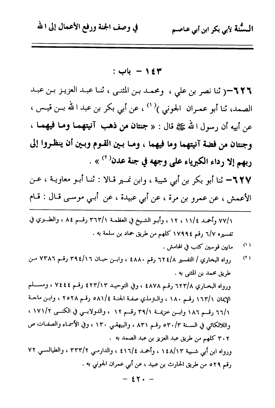 626 - حَدَّثنا نَصْرُ بْنُ عَلِيٍّ، وَمُحَمَّدُ بْنُ الْمُثَنَّى، حَدَّثنا عَبْدُ الْعَزِيزِ بْنُ عَبْدِ الصَّمَدِ، حَدَّثنا أَبُو عِمْرَانَ الْجَوْنِيُّ، عَنْ أَبِي بَكْرِ بْنِ عَبْدِ اللهِ بْنِ قَيْسٍ، عَنْ أَبِيهِ، أَنَّ رَسُولَ اللهِ صَلى الله عَلَيهِ وسَلمَ قَالَ: جَنَّتَانِ مِنْ ذَهَبٍ, آنِيَتُهُمَا وَمَا فِيهِمَا، وَجَنَّتَانِ مِنْ فِضَّةٍ, آنِيَتُهُمَا وَمَا فِيهِمَا، وَمَا بَيْنَ الْقَوْمِ وَبَيْنَ أَنْ يَنْظِرُوا إِلَى رَبِّهِمْ إِلاَّ رِدَاءُ الْكِبْرِيَاءِ عَلَى وَجْهِهِ فِي جَنَّةِ عَدْنٍ.
