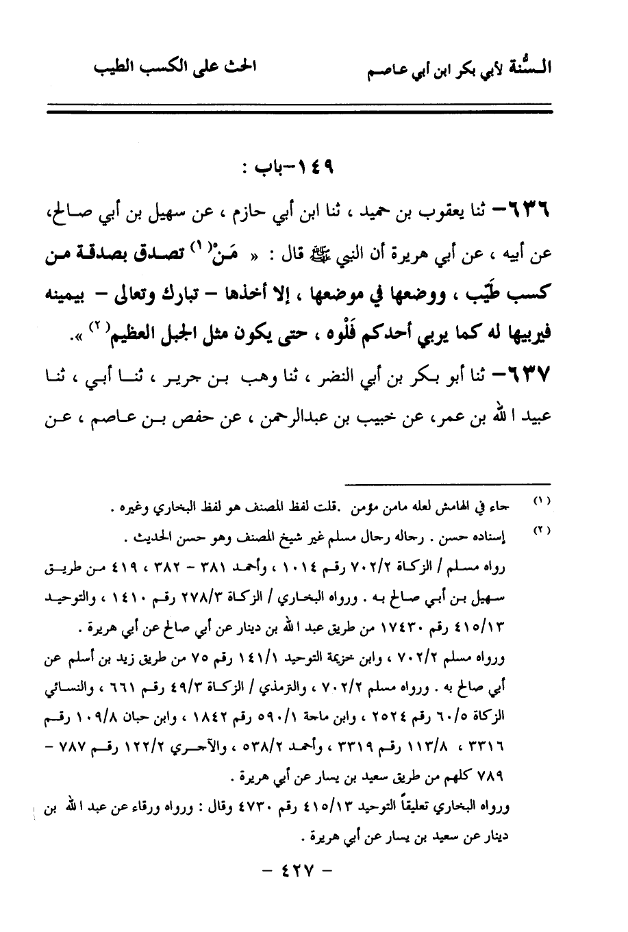 636 - حَدَّثنا يَعْقُوبُ بْنُ حُمَيْدٍ، حَدَّثنا ابْنُ أَبِي حَازِمٍ، عَنْ سُهَيْلِ بْنِ أَبِي صَالِحٍ، عَنْ أَبِيهِ، عَنْ أَبِي هُرَيْرَةَ، أَنَّ النَّبِيَّ صَلى الله عَلَيهِ وسَلمَ قَالَ: مَنْ تَصَدَّقَ بِصَدَقَةٍ مِنْ كَسْبٍ طَيِّبٍ، وَوَضَعَهَا فِي مَوْضِعِهَا، إِلاَّ أَخَذَهَا تَبَارَكَ وَتَعَالَى بِيَمِينِهِ, فَيُرَبِّيهَا لَهُ, كَمَا يُرَبِّي أَحَدُكُمْ فَلُوَّهُ، حَتَّى يَكُونَ مِثْلَ الْجَبَلِ الْعَظِيمِ.