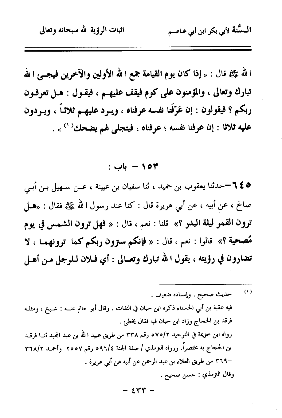 645 - حَدَّثنا يَعْقُوبُ بْنُ حُمَيْدٍ، حَدَّثنا سُفْيَانُ بْنُ عُيَيْنَةَ، عَنْ سُهَيْلِ بْنِ أَبِي صَالِحٍ، عَنْ أَبِيهِ، عَنْ أَبِي هُرَيْرَةَ، قَالَ: كُنَّا عِنْدَ رَسُولِ اللهِ صَلى الله عَلَيهِ وسَلمَ, فَقَالَ: هَلْ تَرَوْنَ الْقَمَرَ لَيْلَةَ الْبَدْرِ؟ قُلْنَا: نَعَمْ، قَالَ: فَهَلْ تَرَوْنَ الشَّمْسَ فِي يَوْمٍ مُصْحِيَةً؟ قَالُوا: نَعَمْ، قَالَ: فَإِنَّكُمْ سَتَرَوْنَ رَبَّكُمْ كَمَا تَرَوْنَهُمَا، لاَ تُضَارُّونَ فِي رُؤْيَتِهِ، يَقُولُ اللهُ تَبَارَكَ وَتَعَالَى: أَيْ فُلاَنُ، لِلرَّجُلِ مِنْ أَهْلِ الْجَاهِلِيَّةِ، أَلَمْ أُكْرِمْكَ، أَلَمْ أُرَبِّكَ، أَلَمْ أُسَخِّرُ لَكَ الْخَيْلَ وَالإِبِلَ، أَلَمْ أَذَرْكَ تَرْأَسُ وَتَرْبَعُ؟ فَيَقُولُ: بَلَى يَا رَبِّ، قَالَ: فَيَقُولُ: فَهَلْ ظَنَنْتَ أَنَّكَ مُلاَقِيَّ؟ قَالَ: فَيَقُولُ: لاَ، وَاللهِ يَا رَبِّ، قَالَ: فَيَقُولُ: إِنِّي أَنْسَاكَ كَمَا نَسِيتَنِي،