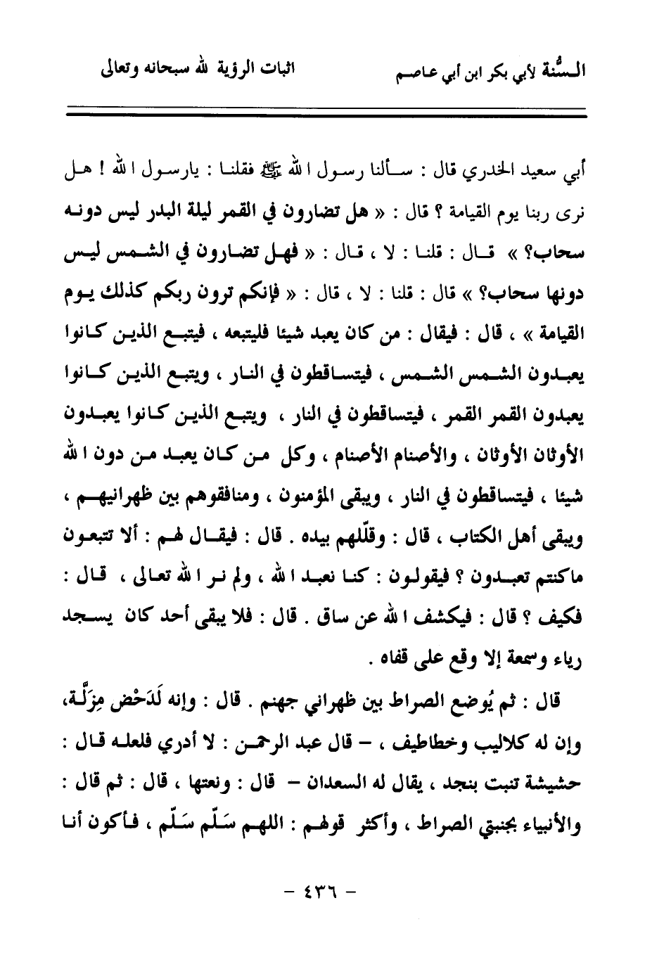 قَالَ: وَقَلَّلَهُمْ بِيَدِهِ, قَالَ: فَيُقَالُ لَهُمْ: أَلاَ تَتَّبِعُونَ مَا كُنْتُمْ تَعْبُدُونَ؟ فَيَقُولُونَ: كُنَّا نَعْبُدُ اللهَ، وَلَمْ نَرَ اللهَ تَعَالَى، قَالَ: فَكَيْفَ؟ قَالَ: فَيَكْشِفُ اللهُ عَنْ سَاقٍ، قَالَ: فَلاَ يَبْقَى أَحَدٌ كَانَ يَسْجُدُ رِيَاءً وَسُمْعَةً, إِلاَّ وَقَعَ عَلَى قَفَاهُ، قَالَ: ثُمَّ يُوضَعُ الصِّرَاطُ بَيْنَ ظَهْرَانَيْ جَهَنَّمَ، قَالَ: وَإِنَّهُ لَدَحْضٌ مِزَلَّةٌ، وَإِنَّ لَهُ كَلاَلِيبَ وَخَطَاطِيفَ، قَالَ عَبْدُ الرَّحْمَنِ: لاَ أَدْرِي فَلَعَلَّهُ قَالَ: حَشِيشَةٌ تَنْبُتُ بِنَجْدٍ، يُقَالُ لَهُ: السَّعْدَانُ، قَالَ: وَنَعَتَهَا، قَالَ: ثُمَّ قَالَ: وَالأَنْبِيَاءُ بِجَنْبَتَيِ الصِّرَاطِ, وَأَكْثَرُ قَوْلِهِمْ: اللهُمَّ سَلِّمْ سَلِّمْ، فَأَكُونُ أَنَا وَأُمَّتِي أَوَّلَ مَنْ يَمُرُّ، أَوْ قَالَ: أَوَّلُ مَنْ يُجِيزُ, قَالَ: فَيَمُرُّونَ عَلَيْهِ مِثْلَ الْبَرْقِ، وَمِثْلَ الرِّيحِ، وَمِثْلَ أَجَاوِيدِ الْخَيْلِ وَالرِّكَابِ، فَنَاجٍ مُسَلَّمٌ، وَمَخْدُوشٌ مُكْلَمٌ، وَمُكَرْدَسٌ فِي النَّارِ، فَإِذَا جَاوَزُوا, أَوْ قَالَ: فَإِذَا قَطَعُوهُ,