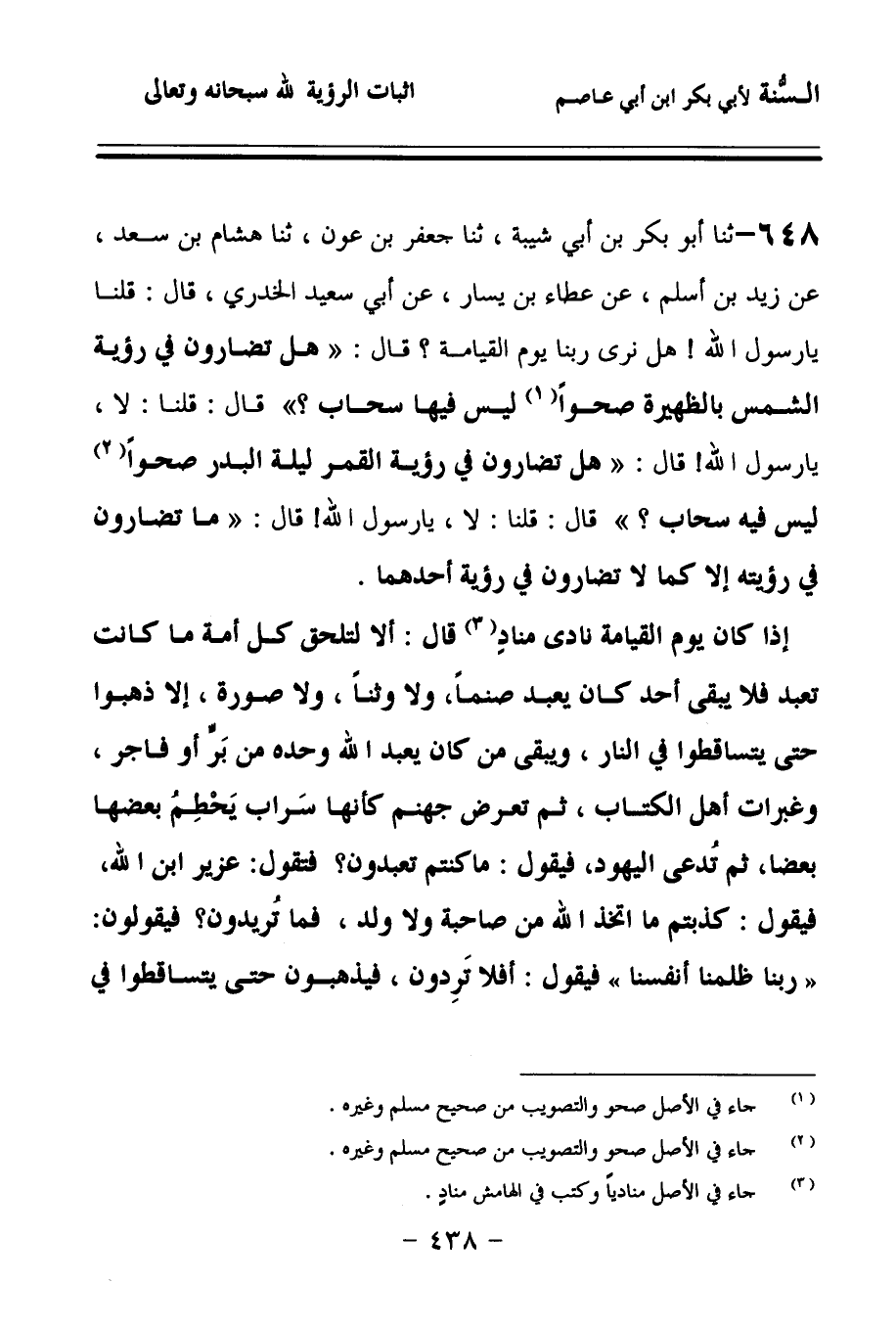 648 - حَدَّثنا أَبُو بَكْرِ بْنُ أَبِي شَيْبَةَ، حَدَّثنا جَعْفَرُ بْنُ عَوْنٍ، حَدَّثنا هِشَامُ بْنُ سَعْدٍ، عَنْ زَيْدِ بْنِ أَسْلَمَ، عَنْ عَطَاءِ بْنِ يَسَارٍ، عَنْ أَبِي سَعِيدٍ الْخُدْرِيِّ، قَالَ: قُلْنَا: يَا رَسُولَ اللهِ, هَلْ نَرَى رَبَّنَا يَوْمَ الْقِيَامَةِ؟ قَالَ: هَلْ تُضَارُّونَ فِي رُؤْيَةِ الشَّمْسِ بِالظَّهِيرَةِ، صَحْوًا لَيْسَ فِيهَا سَحَابٌ؟ قَالَ: قُلْنَا: لاَ، يَا رَسُولَ اللهِ، قَالَ: هَلْ تُضَارُّونَ فِي رُؤْيَةِ الْقَمَرِ لَيْلَةَ الْبَدْرِ، صَحْوًا لَيْسَ فِيهِ سَحَابٌ؟ قَالَ: قُلْنَا: لاَ، يَا رَسُولَ اللهِ، قَالَ: مَا تُضَارُّونَ فِي رُؤْيَتِهِ إِلاَّ كَمَا لاَ تُضَارُّونَ فِي رُؤْيَةِ أَحَدِهِمَا، إِذَا كَانَ يَوْمُ الْقِيَامَةِ نَادَى مُنَادٍ قَالَ: أَلاَ لِتَلْحَقْ كُلُّ أُمَّةٍ مَا كَانَتْ تَعْبُدُ، فَلاَ يَبْقَى أَحَدٌ كَانَ يَعْبُدُ صَنَمًا وَلاَ وَثَنًا وَلاَ صُورَةً إِلاَّ ذَهَبُوا، حَتَّى يَتَسَاقَطُوا فِي النَّارِ، وَيَبْقَى مَنْ كَانَ يَعْبُدُ اللهَ وَحْدَهُ مِنْ بَرٍّ أَوْ فَاجِرٍ وَغُبَّرَاتُ أَهْلِ الْكِتَابِ، ثُمَّ تَعْرِضُ جَهَنَّمَ كَأَنَّهَا سَرَابٌ يَحْطِمُ بَعْضُهَا بَعْضًا، ثُمَّ تُدْعَى الْيَهُودُ فَيَقُولُ: مَا كُنْتُمْ تَعْبُدُونَ؟ فَتَقُولُ: عُزَيْرَ ابْنَ اللهِ، فَيَقُولُ: كَذَبْتُمْ، مَا اتَّخَذَ اللهُ مِنْ صَاحِبَةٍ وَلاَ وَلَدٍ، فَمَا تُرِيدُونَ؟ فَيَقُولُونَ: {رَبَّنَا ظَلَمْنَا أَنْفُسَنَا} , فَيَقُولُ: أَفَلاَ تَرِدُونَ؟ فَيَذْهَبُونَ, حَتَّى يَتَسَاقَطُوا فِي النَّارِ،