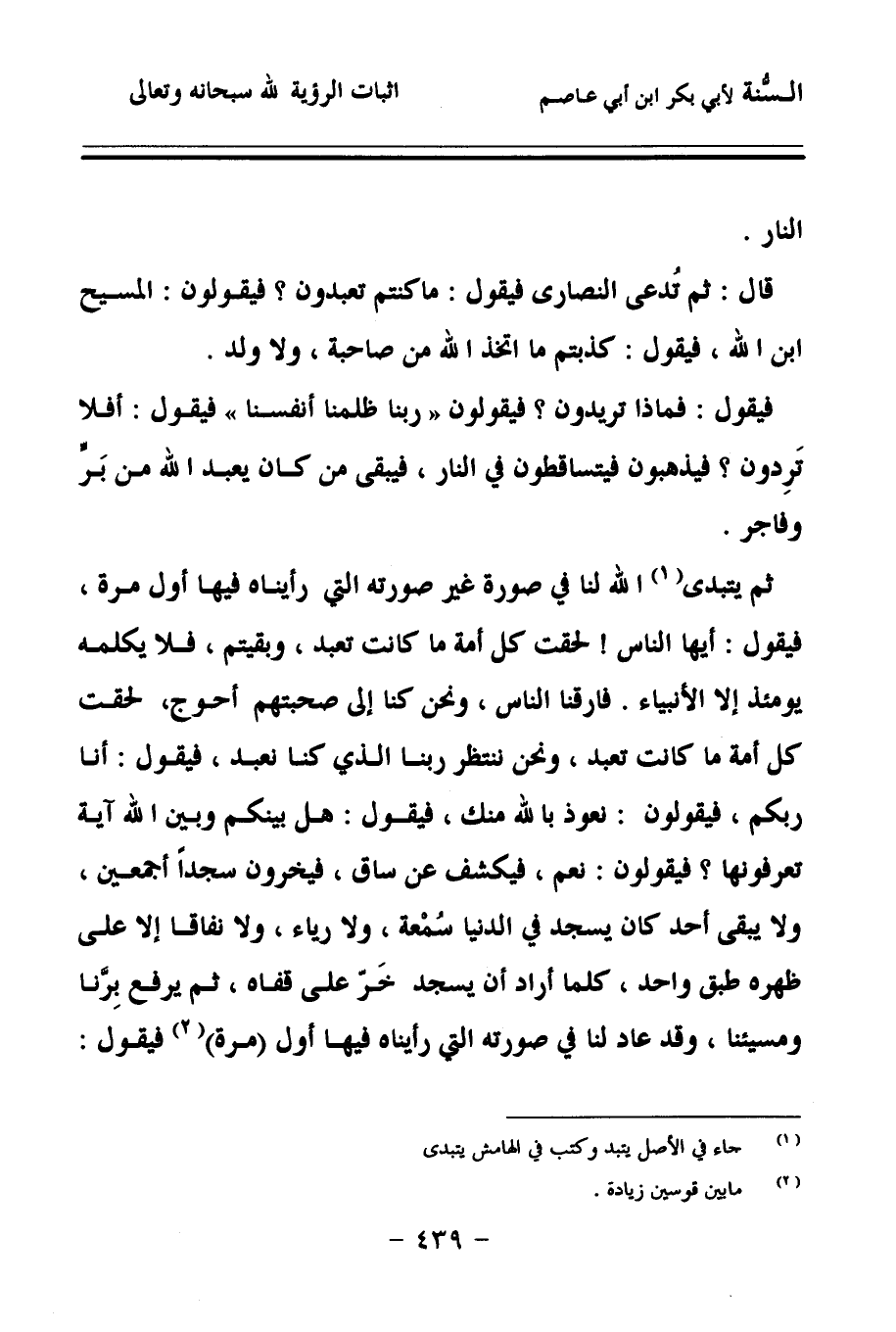 قَالَ: ثُمَّ تُدْعَى النَّصَارَى فَيَقُولُ: مَا كُنْتُمْ تَعْبُدُونَ؟ فَيَقُولُونَ: الْمَسِيح ابْن اللهِ، فَيَقُولُ: كَذَبْتُمْ، مَا اتَّخَذَ اللهُ مِنْ صَاحِبَةٍ وَلاَ وَلَدٍ، فَيَقُولُ: مَاذَا تُرِيدُونَ؟ فَيَقُولُونَ: {رَبَّنَا ظَلَمْنَا أَنْفُسَنَا} فَيَقُولُ: أَفَلاَ تَرِدُونَ؟ فَيَذْهَبُونَ, فَيَتَسَاقَطُونَ فِي النَّارِ، فَيَبْقَى مَنْ كَانَ يَعْبُدُ اللهَ مِنْ بَرٍّ وَفَاجِرٍ، ثُمَّ يَتَبَدَّى اللهُ لَنَا فِي صُورَةٍ غَيْرِ صُورَتِهِ الَّتِي رَأَيْنَاهُ فِيهَا أَوَّلَ مَرَّةٍ، فَيَقُولُ: أَيُّهَا النَّاسُ, لَحِقَتْ كُلُّ أُمَّةٍ مَا كَانَتْ تَعْبُدُ وَبَقِيتُمْ، فَلاَ يُكَلِّمُهُ يَوْمَئِذٍ إِلاَّ الأَنْبِيَاءُ: فَارَقَنَا النَّاسُ، وَنَحْنُ كُنَّا إِلَى صُحْبَتِهِمْ أَحْوَجَ، لَحِقَتْ كُلُّ أُمَّةٍ مَا كَانَتْ تَعْبُدُ، وَنَحْنُ نَنْتَظِرُ رَبَّنَا الَّذِي كُنَّا نَعْبُدُ، فَيَقُولُ: أَنَا رَبُّكُمْ، فَيَقُولُونَ: نَعُوذُ بِاللهِ مِنْكَ، فَيَقُولُ: هَلْ بَيْنَكُمْ وَبَيْنَ اللهِ آيَةٌ تَعْرِفُونَهَا؟ فَيَقُولُونَ: نَعَمْ، فَيَكْشِفُ عَنْ سَاقٍ، فَيَخِرُّونَ سُجَّدًا أَجْمَعِينَ، وَلاَ يَبْقَى أَحَدٌ كَانَ يَسْجُدُ فِي الدُّنْيَا سُمْعَةً وَلاَ رِيَاءً وَلاَ نِفَاقًا، إِلاَّ عَلَى ظَهْرِهِ طَبَقَ وَاحِدٌ, كُلَّمَا أَرَادَ أَنْ يَسْجُدَ خَرَّ عَلَى قَفَاهُ، ثُمَّ يَرْفَعُ بَرَّنَا وَمُسِيئَنَا، وَقَدْ عَادَ لَنَا فِي صُورَتِهِ الَّتِي رَأَيْنَاهُ فِيهَا أَوَّلَ مَرَّةٍ, فَيَقُولُ: أَنَا رَبُّكُمْ، فَنَقُولُ: نَعَمْ، ثُمَّ ذَكَرَ الْحَدِيثَ بِطُولِهِ.