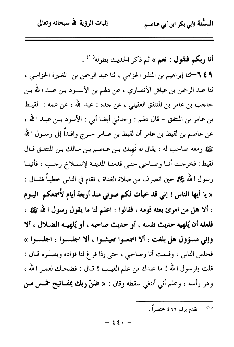 649 - حَدَّثنا إِبْرَاهِيمُ بْنُ الْمُنْذِرِ الْحِزَامِيُّ، حَدَّثنا عَبْدُ الرَّحْمَنِ بْنُ الْمُغِيرَةِ الْحِزَامِيُّ، حَدَّثنا عَبْدُ الرَّحْمَنِ بْنُ عَيَّاشٍ الأَنْصَارِيُّ، عَنْ دَلْهَمِ بْنِ الأَسْوَدِ بْنِ عَبْدِ اللهِ بْنِ حَاجِبِ بْنِ عامر بن الْمُنْتَفِقِ الْعُقَيْلِيِّ، عَنْ جَدِّهِ عَبْدِ اللهِ، عَنْ عَمِّهِ لَقِيطِ بْنِ عَامِرِ بْنِ الْمُنْتَفِقِ، قَالَ دَلْهَمٌ: وَحَدَّثَنِي أَيْضًا أَبِي: الأَسْوَدُ بْنُ عَبْدِ اللهِ، عَنْ عَاصِمِ بْنِ لَقِيطِ بْنِ عَامِرٍ، أَنَّ لَقِيطَ بْنَ عَامِرٍ خَرَجَ وَافِدًا إِلَى رَسُولِ اللهِ صَلى الله عَلَيهِ وسَلمَ وَمَعَهُ صَاحِبٌ لَهُ, يُقَالُ لَهُ: نَهِيكُ بْنُ عَاصِمِ بْنِ مَالِكِ بْنِ الْمُنْتَفِقِ، قَالَ لَقِيطٌ: فَخَرَجْتُ أَنَا وَصَاحِبِي حَتَّى قَدِمْنَا الْمَدِينَةَ لاِنْسِلاَخِ رَجَبٍ، فَأَتَيْنَا رَسُولَ اللهِ صَلى الله عَلَيهِ وسَلمَ حِينَ انْصَرَفَ مِنْ صَلاَةِ الْغَدَاةِ، فَقَامَ فِي النَّاسِ خَطِيبًا, فَقَالَ: يَا أَيُّهَا النَّاسُ، إِنِّي قَدْ خَبَّأْتُ لَكُمْ صَوْتِي مُنْذُ أَرْبَعَةِ أَيَّامٍ لأُسْمِعَكُمُ الْيَوْمَ، أَلاَ هَلْ مِنِ امْرِئٍ بَعَثَهُ قَوْمُهُ؟ فَقَالُوا: اعْلَمْ لَنَا مَا يَقُولُ رَسُولُ اللهِ صَلى الله عَلَيهِ وسَلمَ، فَلَعَلَّهُ أَنْ يُلْهِيَهُ حَدِيثُ نَفْسِهِ، أَوْ حَدِيثُ صَاحِبِهِ، أَوْ يُلْهِيَهُ الضُّلاَّلُ، أَلاَ وَإِنِّي مَسْؤُولٌ: هَلْ بَلَّغْتَ؟ أَلاَ اسْمَعُوا تَعِيشُوا، أَلاَ اجْلِسُوا اجْلِسُوا، فَجَلَسَ النَّاسُ, وَقُمْتُ أَنَا وَصَاحِبِي, حَتَّى إِذَا فَرَغَ لَنَا فُؤَادُهُ وَبَصَرُهُ, قَالَ: قُلْتُ: يَا رَسُولَ اللهِ, مَا عِنْدَكَ مِنْ عِلْمِ الْغَيْبِ؟ قَالَ: فَضَحِكَ، لَعَمْرُ اللهِ، وَهَزَّ رَأْسَهُ وَعَلِمَ أَنِّي أَبْتَغِي سَقَطَهُ,