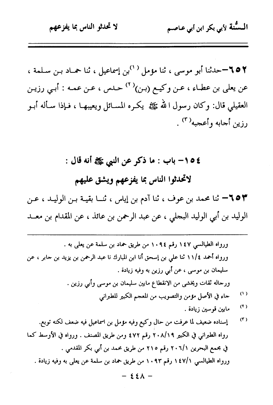 653 - حَدَّثنا مُحَمَّدُ بْنُ عَوْفٍ، حَدَّثنا آدَمُ بْنُ [أَبِي] إِيَاسٍ، حَدَّثنا بَقِيَّةُ بْنُ الْوَلِيدِ، عَنِ الْوَلِيدِ بْنِ أَبِي الْوَلِيدِ الْبَجَلِيِّ، عَنْ عَبْدِ الرَّحْمَنِ بْنِ عَائِذٍ، عَنِ الْمِقْدَامِ بْنِ مَعْدِي كَرِبَ، قَالَ: قَالَ رَسُولُ اللهِ صَلى الله عَلَيهِ وسَلمَ: إِذَا حَدَّثْتُمُ النَّاسَ عَنْ رَبِّهِمْ فَلاَ تُحَدِّثُوهُمْ بِمَا يُفْزِعُهُمْ وَيَشُقُّ عَلَيْهِمْ.