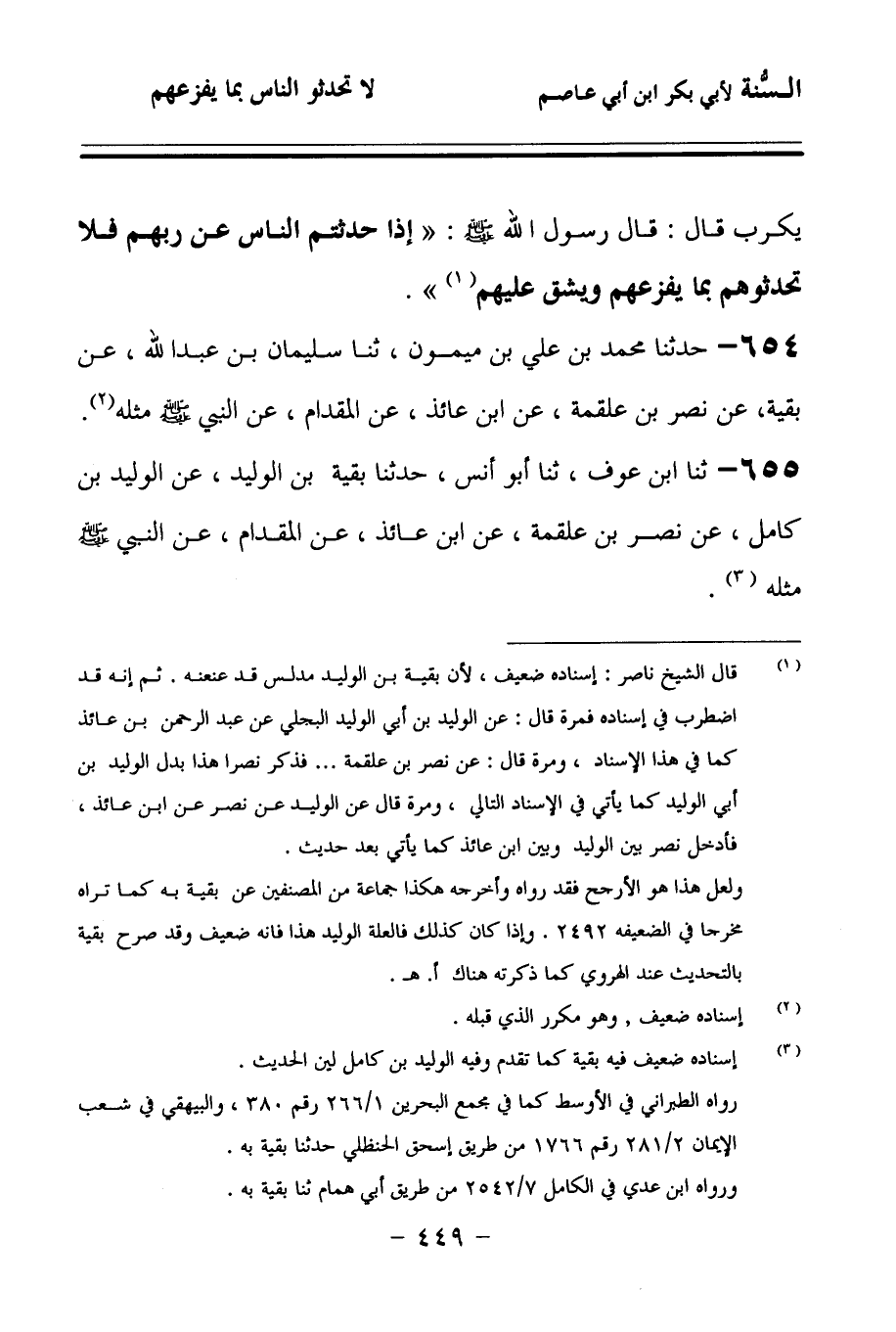 655 - حَدَّثنا ابْنُ عَوْفٍ، حَدَّثنا أَبُو أَنَسٍ، حَدَّثنا بَقِيَّةُ بْنُ الْوَلِيدِ، عَنِ الْوَلِيدِ بْنِ كَامِلٍ، عَنْ نَصْرِ بْنِ عَلْقَمَةَ، عَنِ ابْنِ عَائِذٍ، عَنِ الْمِقْدَامِ، عَنِ النَّبِيِّ صَلى الله عَلَيهِ وسَلمَ، مِثْلَهُ.