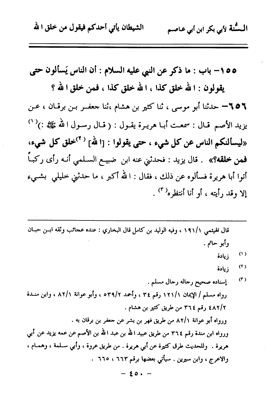 656 - حَدَّثنا أَبُو مُوسَى، حَدَّثنا كَثِيرُ بْنُ هِشَامٍ، حَدَّثنا جَعْفَرُ بْنُ بُرْقَانَ، عَنْ يَزِيدَ بْنِ الأَصَمِّ، قَالَ: سَمِعْتُ أَبَا هُرَيْرَةَ يَقُولُ: (قَالَ رَسُولُ اللهِ صَلى الله عَلَيهِ وسَلمَ):لَيَسْأَلَنَّكُمُ النَّاسُ عَنْ كُلِّ شَيْءٍ حَتَّى يَقُولُوا: اللهُ خَلَقَ كُلَّ شَيْءٍ، فَمَنْ خَلَقَهُ.