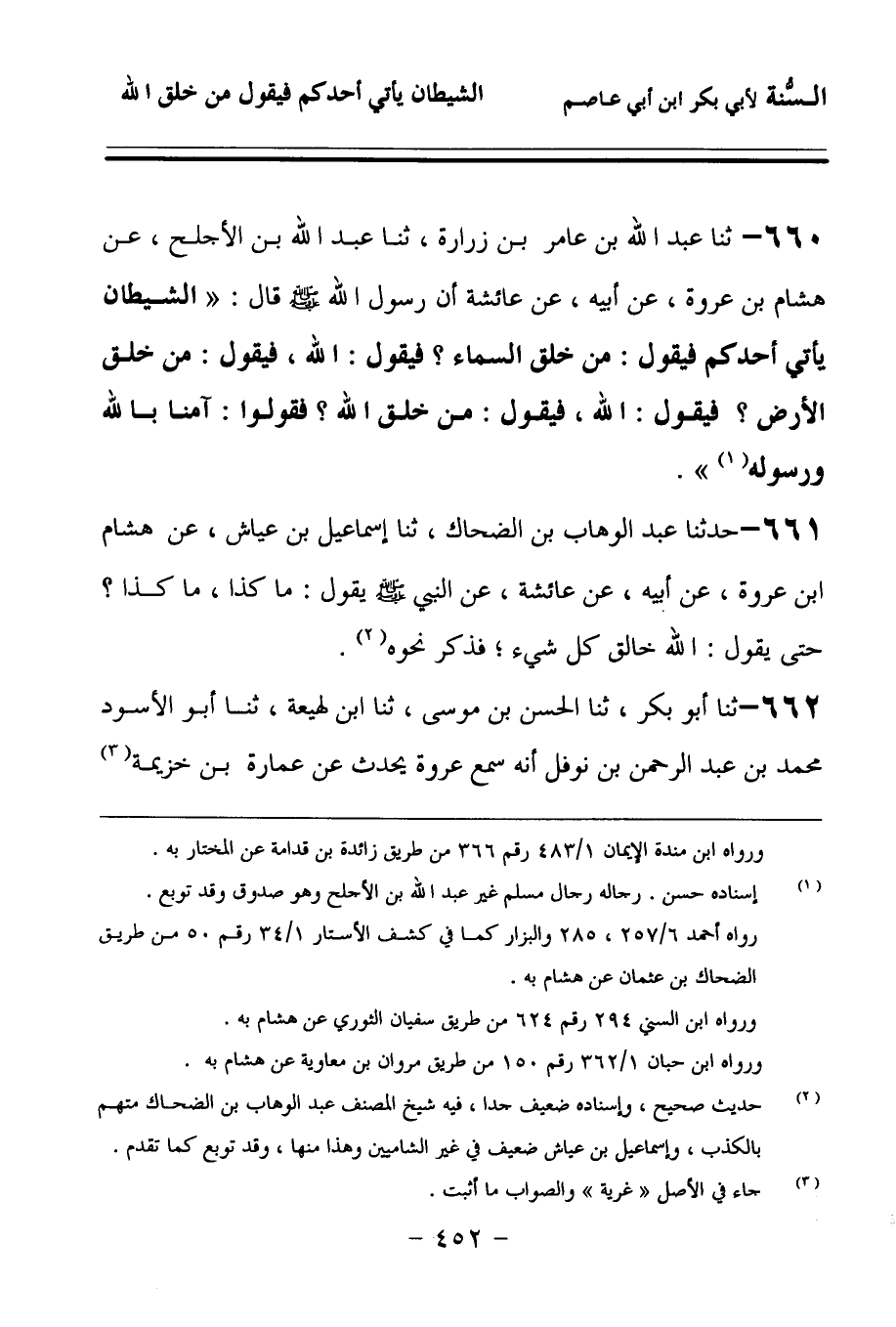 660 - حَدَّثنا عَبْدُ اللهِ بْنُ عَامِرِ بْنِ زُرَارَةَ، حَدَّثنا عَبْدُ اللهِ بْنُ الأَجْلَحِ، عَنْ هِشَامِ بْنِ عُرْوَةَ، عَنْ أَبِيهِ، عَنْ عَائِشَةَ، أَنَّ رَسُولَ اللهِ صَلى الله عَلَيهِ وسَلمَ قَالَ: الشَّيْطَانُ يَأْتِي أَحَدَكُمْ فَيَقُولُ: مَنْ خَلَقَ السَّمَاءَ؟ فَيَقُولُ: اللهُ، فَيَقُولُ: مَنْ خَلَقَ الأَرْضَ؟ فَيَقُولُ: اللهُ، فَيَقُولُ: مَنْ خَلَقَ اللهَ؟ فَقُولُوا: آمَنَّا بِاللهِ وَرَسُولِهِ.