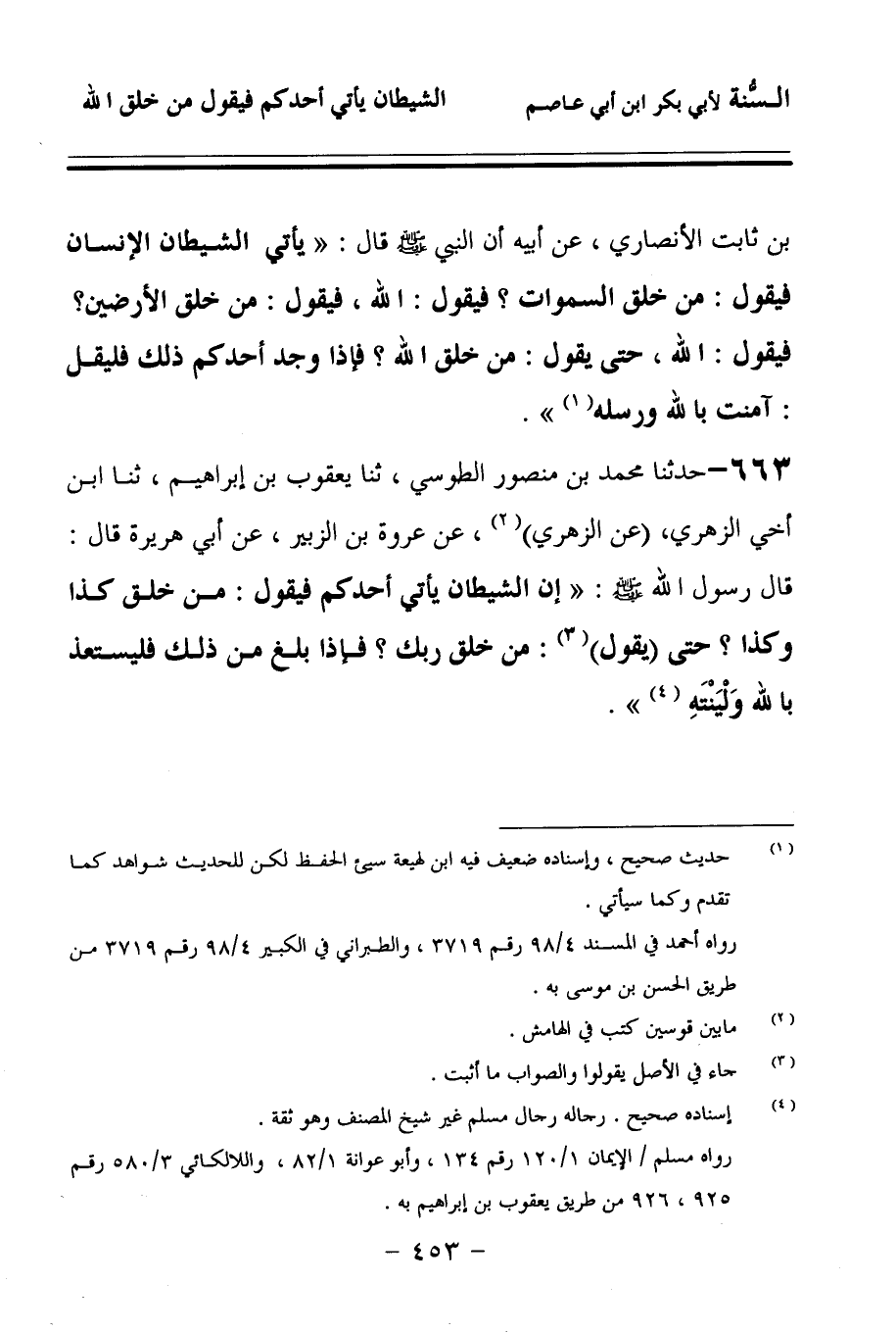 663 - حَدَّثنا مُحَمَّدُ بْنُ مَنْصُورٍ الطُّوسِيُّ، حَدَّثنا يَعْقُوبُ بْنُ إِبْرَاهِيمَ، حَدَّثنا ابْنُ أَخِي الزُّهْرِيِّ، (عَنِ الزُّهْرِيِّ)، عَنْ عُرْوَةَ بْنِ الزُّبَيْرِ، عَنْ أَبِي هُرَيْرَةَ، قَالَ: قَالَ رَسُولُ اللهِ صَلى الله عَلَيهِ وسَلمَ: إِنَّ الشَّيْطَانَ يَأْتِي أَحَدَكُمْ فَيَقُولُ: مَنْ خَلَقَ كَذَا وَكَذَا؟ حَتَّى يَقُولَ: مَنْ خَلَقَ رَبَّكَ؟ فَإِذَا بَلَغَ مِنْ ذَلِكَ: فَلْيَسْتَعِذْ بِاللهِ وَلْيَنْتَهِ.