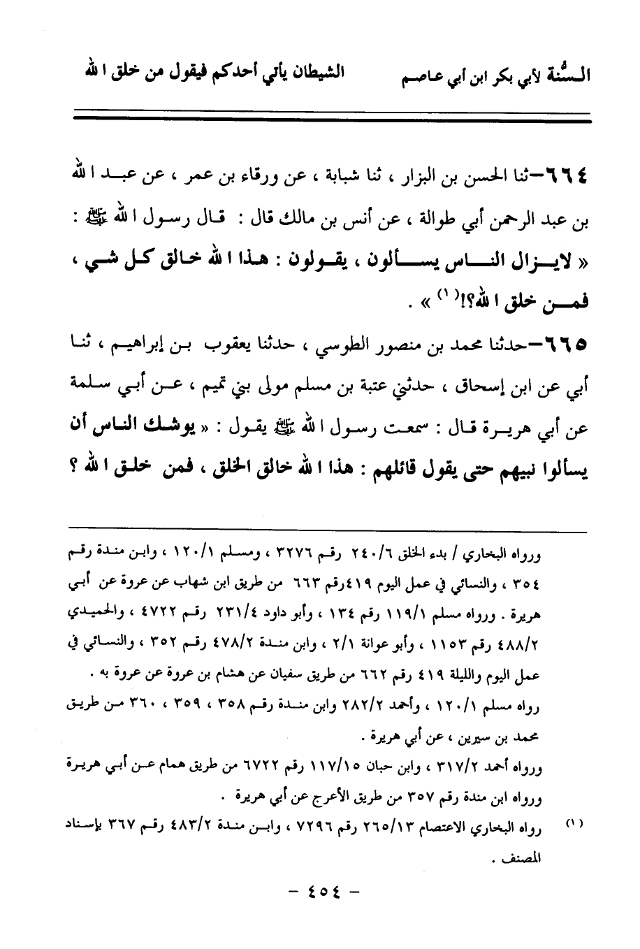 664 - حَدَّثنا الْحَسَنُ بْنُ الْبَزَّارِ، حَدَّثنا شَبَابَةُ، عَنْ وَرْقَاءَ بْنِ عُمَرَ، عَنْ عَبْدِ اللهِ بْنِ عَبْدِ الرَّحْمَنِ, أَبِي طُوَالَةَ، عَنْ أَنَسِ بْنِ مَالِكٍ، قَالَ: قَالَ رَسُولُ اللهِ صَلى الله عَلَيهِ وسَلمَ: لاَ يَزَالُ النَّاسُ يَسْأَلُونَ, يَقُولُونَ: هَذَا اللهُ خَالِقُ كُلِّ شَيْءٍ، فَمَنْ خَلَقَ اللهَ؟.