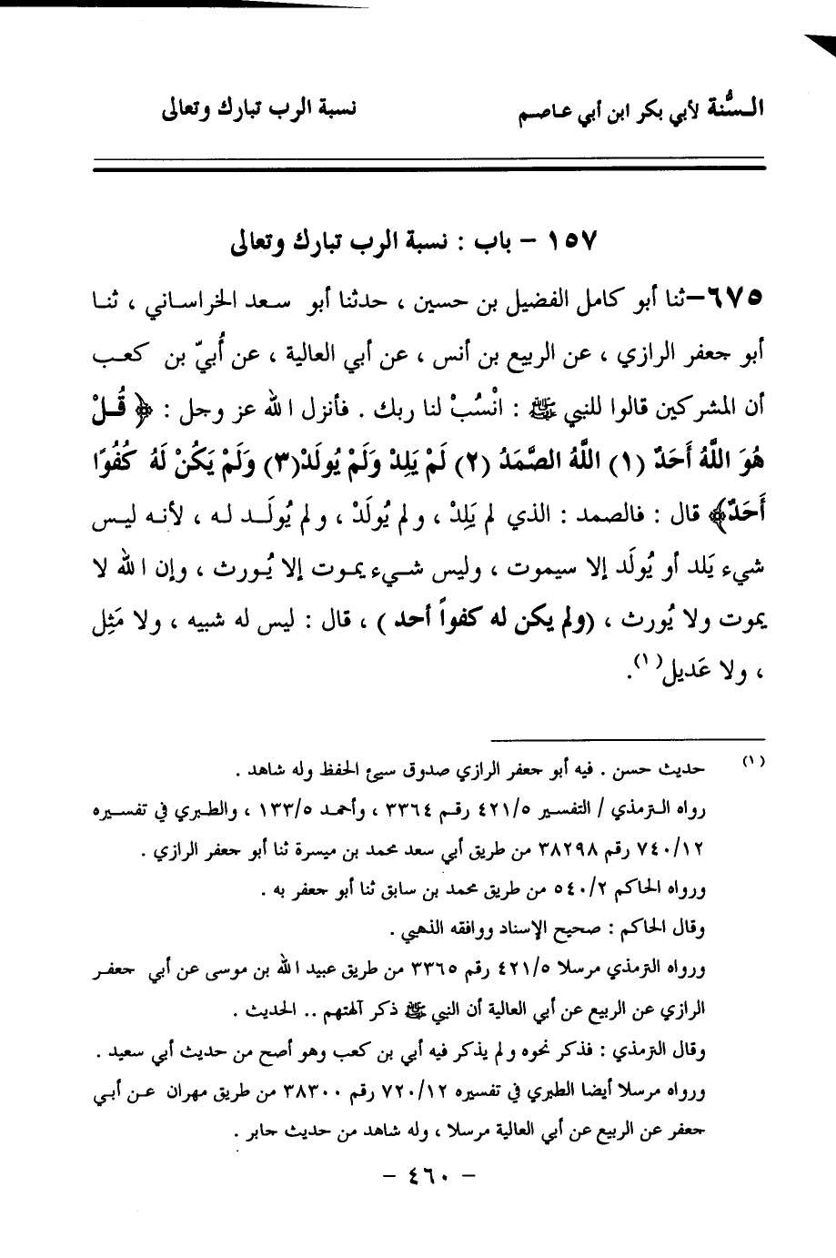 675 - حَدَّثنا أَبُو كَامِلٍ الْفُضَيْلُ بْنُ حُسَيْنٍ، حَدَّثنا أَبُو سَعْدٍ الْخُرَاسَانِيُّ، حَدَّثنا أَبُو جَعْفَرٍ الرَّازِيُّ، عَنِ الرَّبِيعِ بْنِ أَنَسٍ، عَنْ أَبِي الْعَالِيَةِ، عَنْ أُبَيِّ بْنِ كَعْبٍ، أَنَّ الْمُشْرِكِينَ قَالُوا لِلنَّبِيِّ صَلى الله عَلَيهِ وسَلمَ: انْسُبْ لَنَا رَبَّكَ، فَأَنْزَلَ اللهُ عَزَّ وَجَلَّ: {قُلْ هُوَ اللهُ أَحَدٌ اللهُ الصَّمَدُ لَمْ يَلِدْ وَلَمْ يُولَدْ وَلَمْ يَكُنْ لَهُ كُفُوًا أَحَدٌ} قَالَ: فَالصَّمَدُ: الَّذِي لَمْ يَلِدْ، وَلَمْ يُولَدْ, وَلَمْ يُولَدْ لَهُ، لأَنَّهُ لَيْسَ شَيْءٌ يَلِدُ أَوْ يُولَدُ إِلاَّ سَيَمُوتُ، وَلَيْسَ شَيْء يَمُوتُ إِلاَّ يُورَثُ، وَإِنَّ اللهَ لاَ يَمُوتُ وَلاَ يُورَثُ: {وَلَمْ يَكُنْ لَهُ كُفُوًا أَحَدٌ} قَالَ: لَيْسَ لَهُ شَبِيهٌ، وَلاَ مِثْلٌ، وَلاَ عَدِيلٌ.