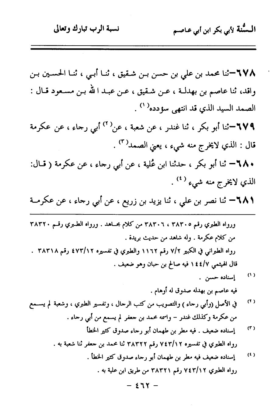 679 - حَدَّثنا أَبُو بَكْرٍ، حَدَّثنا غُنْدَرٌ، عَنْ شُعْبَةَ، عَنْ أَبِي رَجَاءٍ، عَنْ عِكْرِمَةَ، قَالَ: الَّذِي لاَ يَخْرُجُ مِنْهُ شَيْءٌ، يَعْنِي: الصَّمَدَ.