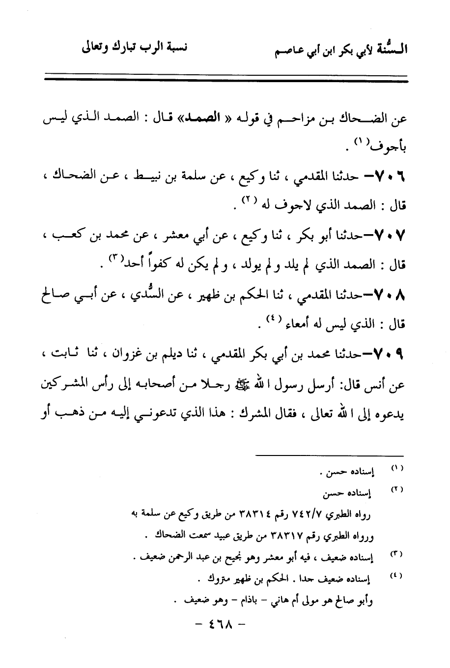 706 - حَدَّثنا الْمُقَدَّمِيُّ، حَدَّثنا وَكِيعٌ، عَنْ سَلَمَةَ بْنِ نُبَيْطٍ، عَنِ الضَّحَّاكِ، قَالَ: الصَّمَدُ: الَّذِي لاَ جَوْفَ لَهُ.